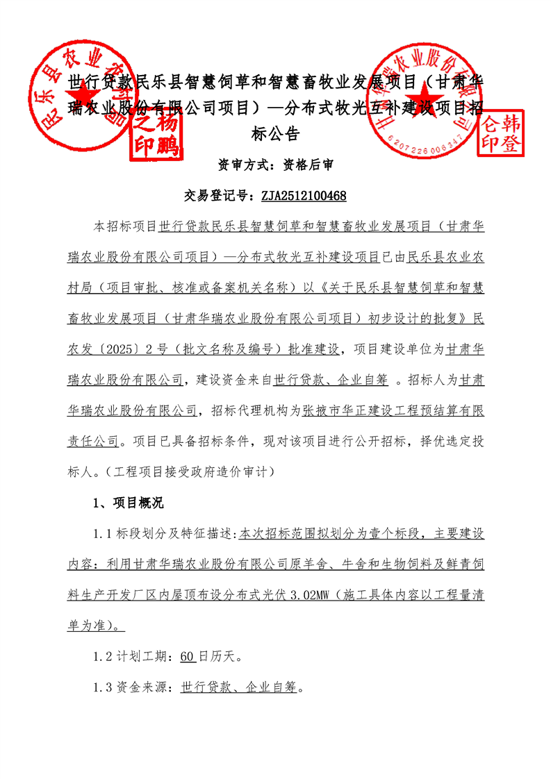 世行贷款民乐县智慧饲草和智慧畜牧业发展项目(甘肃华瑞农业股份有限公司项目)—分布式牧光互补建设项目