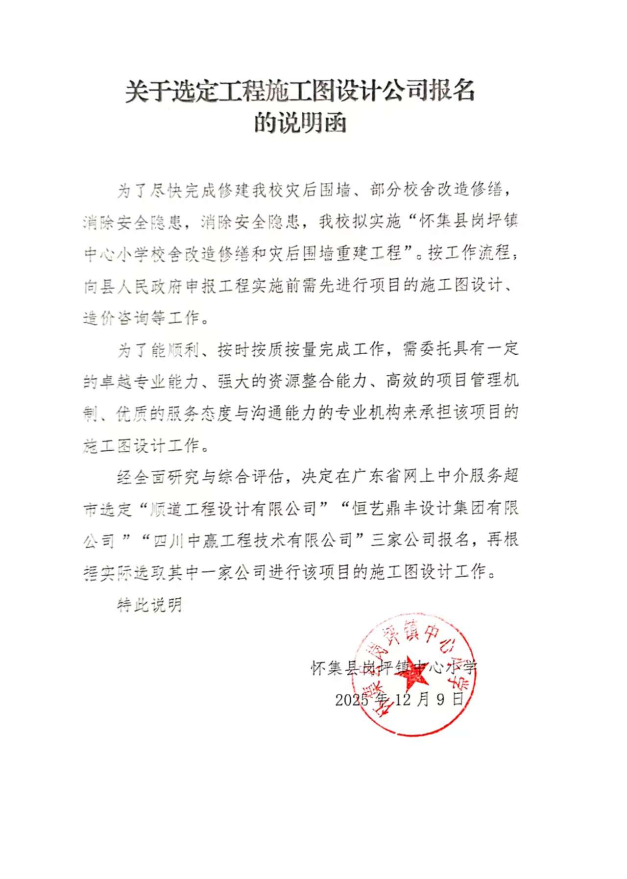 为了尽快完成修建我校灾后围墙、部分校舍改造修缮,消除安全隐患,消除安全隐患,我校拟实施“怀集县岗坪镇中心小学校舍改造修缮和灾后围墙重建工程”。按工作流程,向县人民政府申报工程实施前需先进行项目的施工图设计、造价咨询等工作。 为了能顺利、按时按质按量完成工作,需委托具有一定的卓越专业能力、强大的资源整合能力、高效的项目管理机制、优质的服务态度与沟通能力的专业机构来承担该项目的施工图设计工作。 经全面研究与综合评估,决定在广东省网上中介服务超市选定“顺道工程设计有限公司”“恒艺鼎丰设计集团有限公司”“四川中赢工程技术有限公司”三家公司报名,再根据实际选取其中一家公司进行该项目的施工图设计工作。
