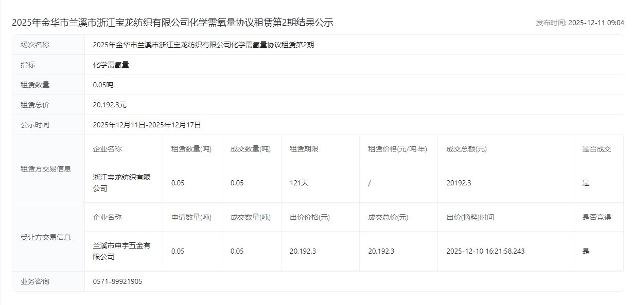 纺织有限公司化学需氧量协议租赁第2期结果公示