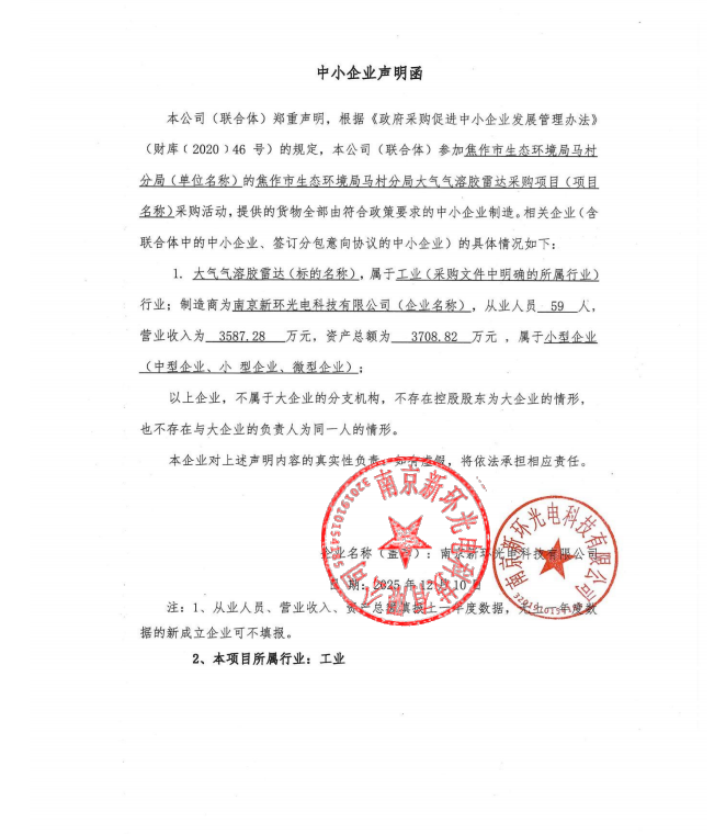 焦作市生态环境局马村分局大气气溶胶雷达采购项目*中标公告