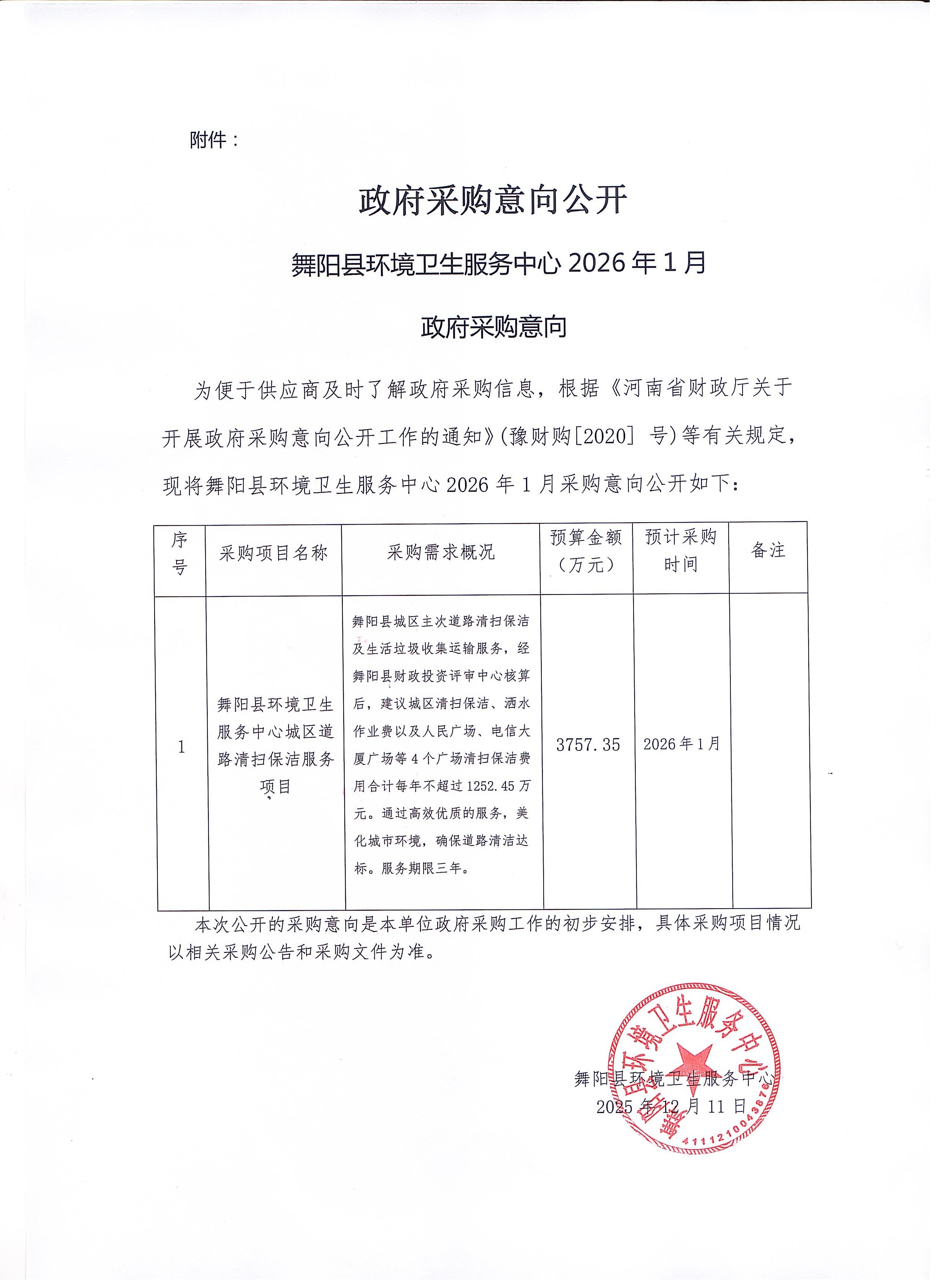 舞阳县环境卫生服务中心2026年1月政府采购意向