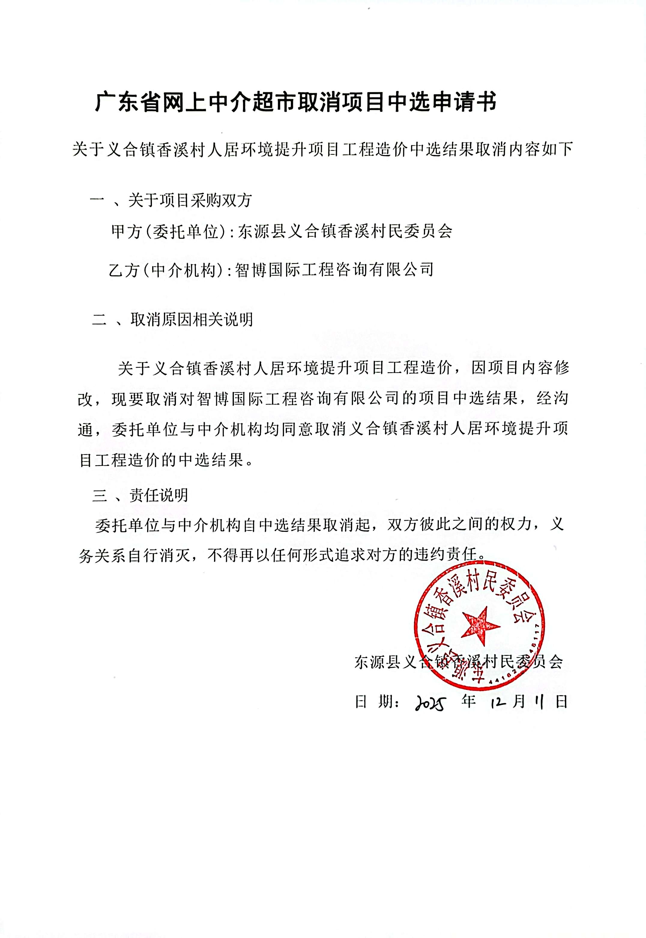 因项目内容修改,现要取消对智博国际工程咨询有限公司的项目中选结果,经沟通,委托单位与中介机构均同意取肖义合镇香溪村人居环境提升项目工程造价的中选结果