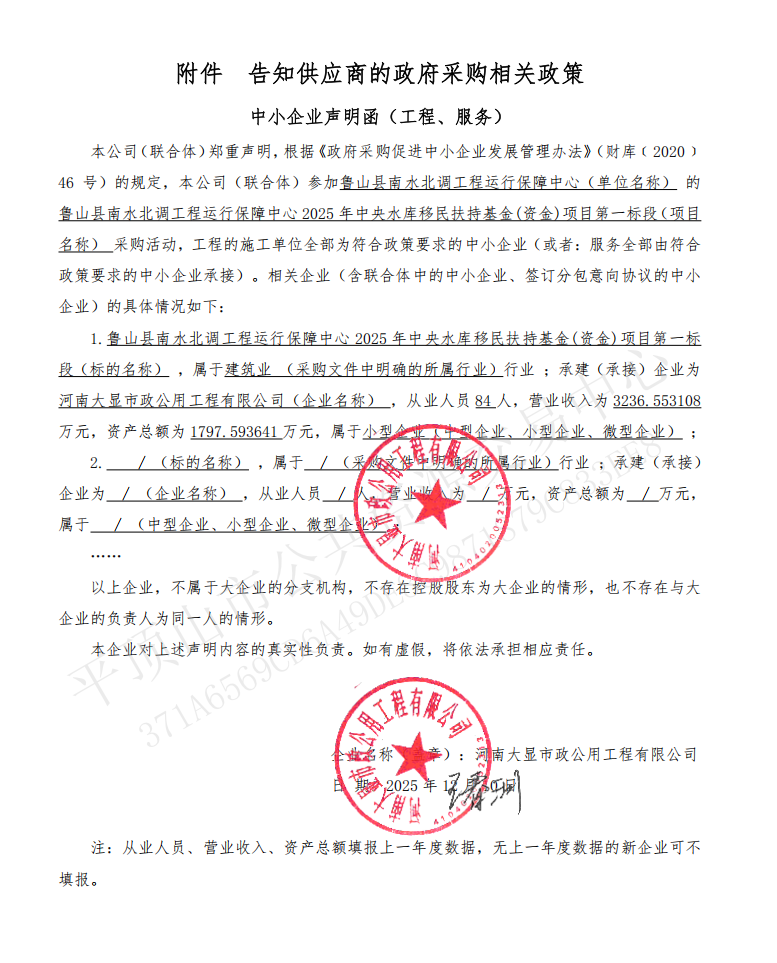 [平顶山市]【平公资采20251136号】鲁山县南水北调工程运行保障中心2025年中央水库移民扶持基金(资金)项目(第一标段)-成交公告