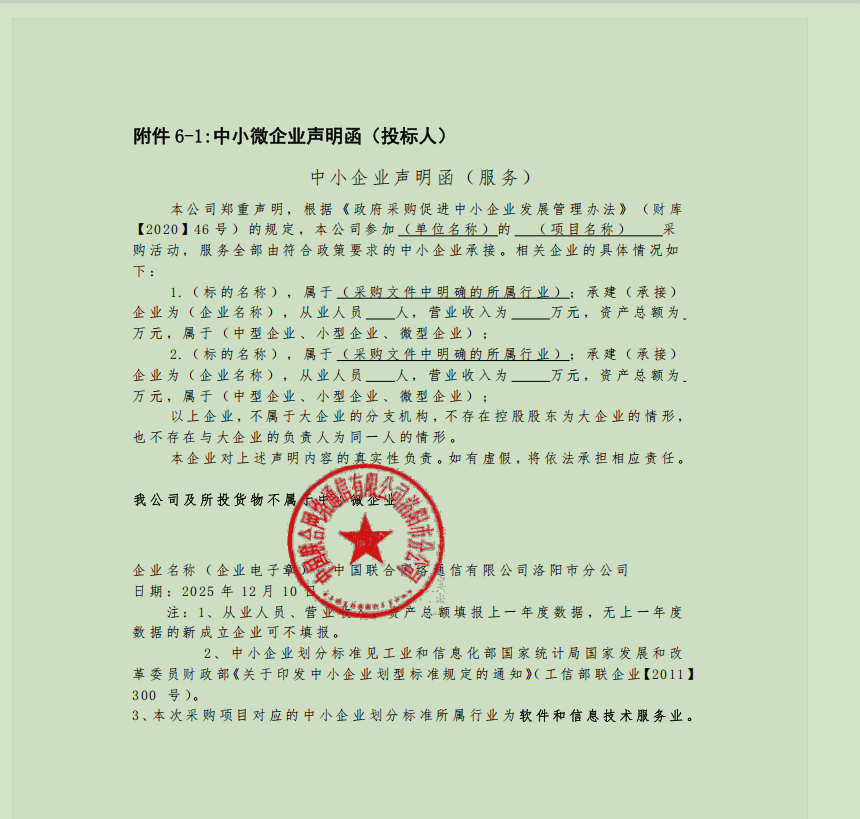 | *.公告日即为中标通知书领取日。公告日起*个工作日内,被授权的成交人代表应到代理机构(或采购单位)指定地点及时领取中标通知书,逾期未领取的,视同公告日已领取。成交人应按照规定的时限和程序与采购单位完成采购合同的签订。 *.资格及符合性审查情况说明:中电信数智科技有限公司河南分公司的“洛阳市政府采购供应商信用承诺函”未按要求签字或盖章,其资格审查不通过。快云(湖北)网络科技有限公司提供的强制节能产品未提供相应型号的节能证书,其符合性审查不通过。 *.各有关当事人对成交结果公告如有异议者,可以在公告结束之日起七个工作日内,通过洛阳市电子招投标交易平台提出质疑或以书面形式向采购代理机构提出质疑(法定代表人签字并加盖单位公章),由法定代表人或其原授权代表携带本人身份证件(原件和复印件)一并提交质疑函原件及相关证明材料(邮寄件、传真件不予受理),逾期未提交或未按照要求提交的质疑函将不予受理。 *.监管部门联系人:洛阳市财政局政府采购科 监管部门联系方式:************* | |||||||||||||||||||||||||||||||