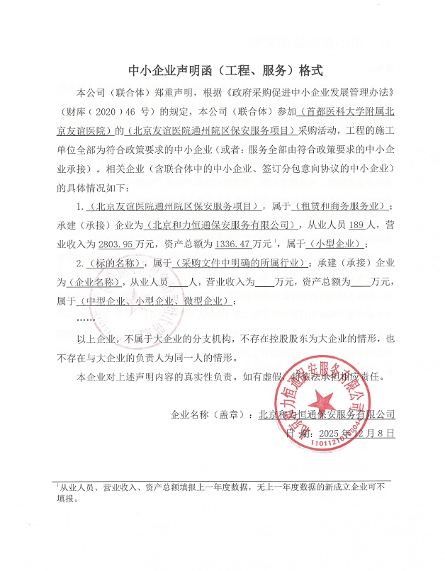 | 北京和力恒通保安服务有限公司 | * | ****.**万元 | ****.**万元 | 负责首都医科大学附属北京友谊医院通州院区及周边的安保、安检工作。提供服务人员共计***人,其中保安人员***人,安检人员**人,详见招标文件。 |