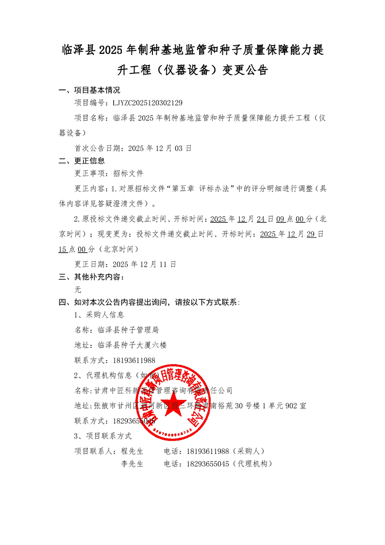 临泽县2025年制种基地监管和种子质量保障能力提升工程(仪器设备)变更公告更正事项