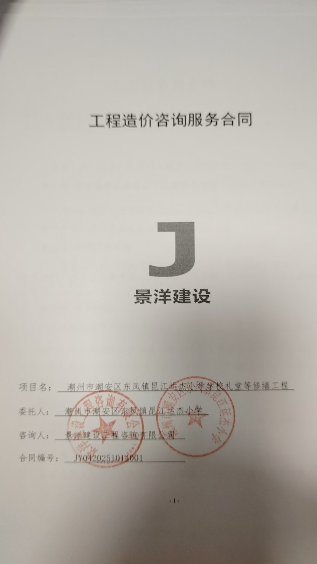潮州市潮安区东凤镇昆江运杰小学学校礼堂等修缮工程-其他费用结算审核合同公开
