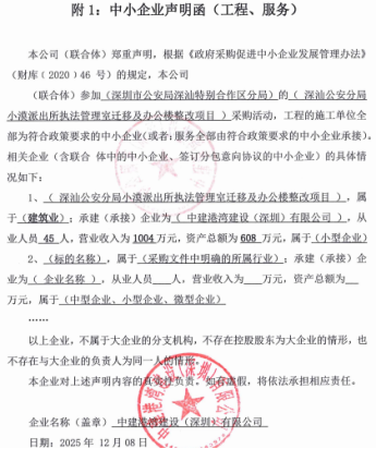| * | 深圳市恒汇建设工程有限公司 | *)营业执照(或事业单位法人证书)等证明资料复印件;*)法定代表人证明书;*)法定代表人授权书;*)政府采购投标及履约承诺函;*)招标代理服务费承诺书;*)投标报价;*)《供应商基本情况表》、社保缴纳证明材料、股权关系证明材料;*)投标人具有有效的安全生产许可证;*)投标人具有有效期内的建筑装修装饰工程专业承包二级或以上资质。结论:资格核查通过。 | ¥***,***.** |