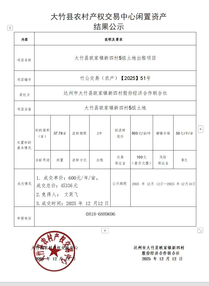 大竹县欧家镇新四村5组土地流转项目结果公示