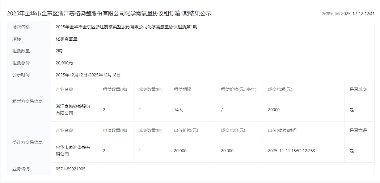 股份有限公司化学需氧量协议租赁第1期结果公示成交公示