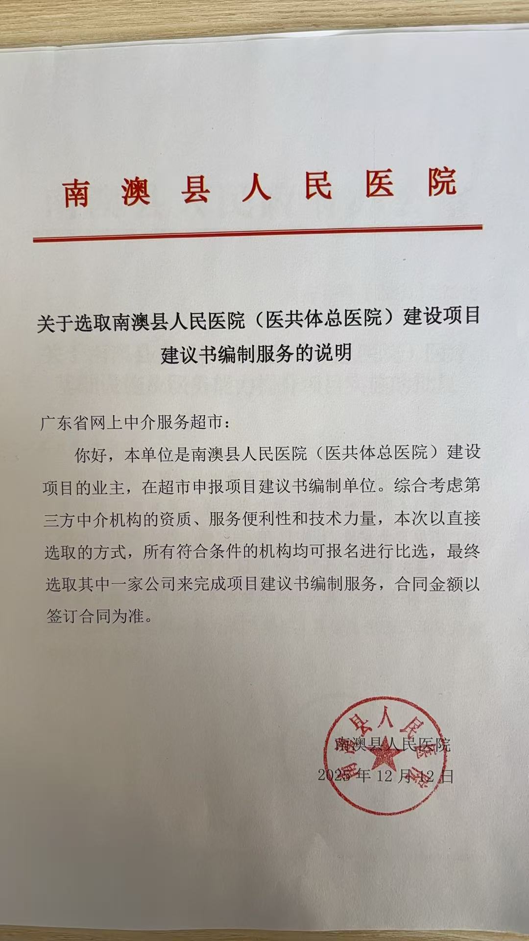 关于为【南澳县人民医院(医共体总医院)建设项目建议书编制】公开选取【工程咨询】机构的公告