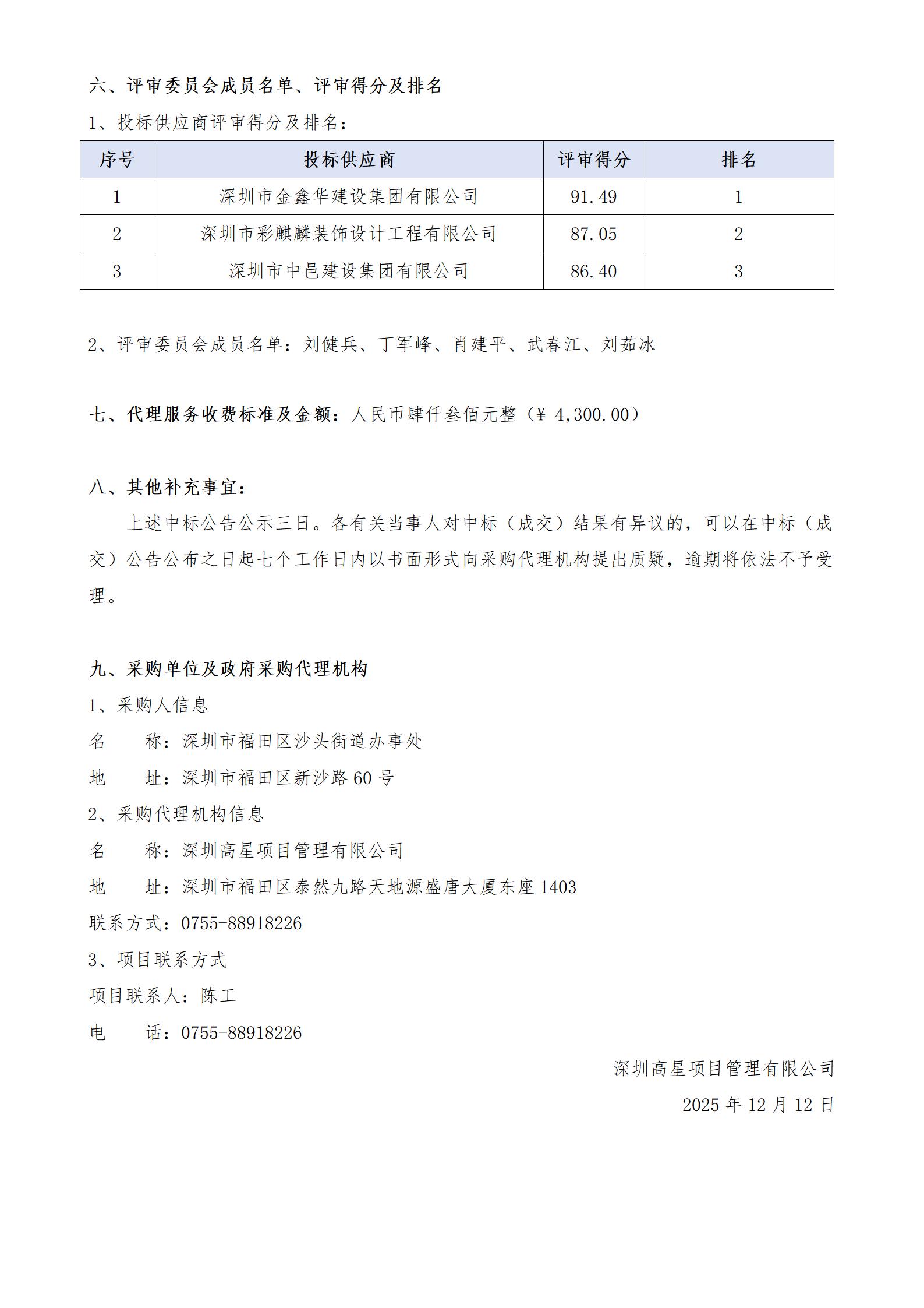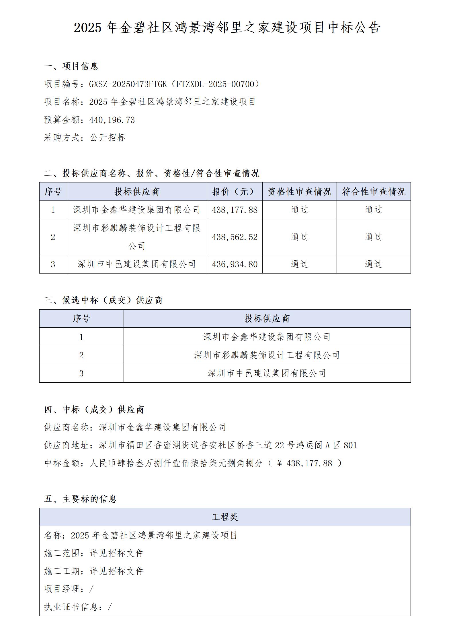 12025年金碧社区鸿景湾邻里之家建设项目的采购结果公告
