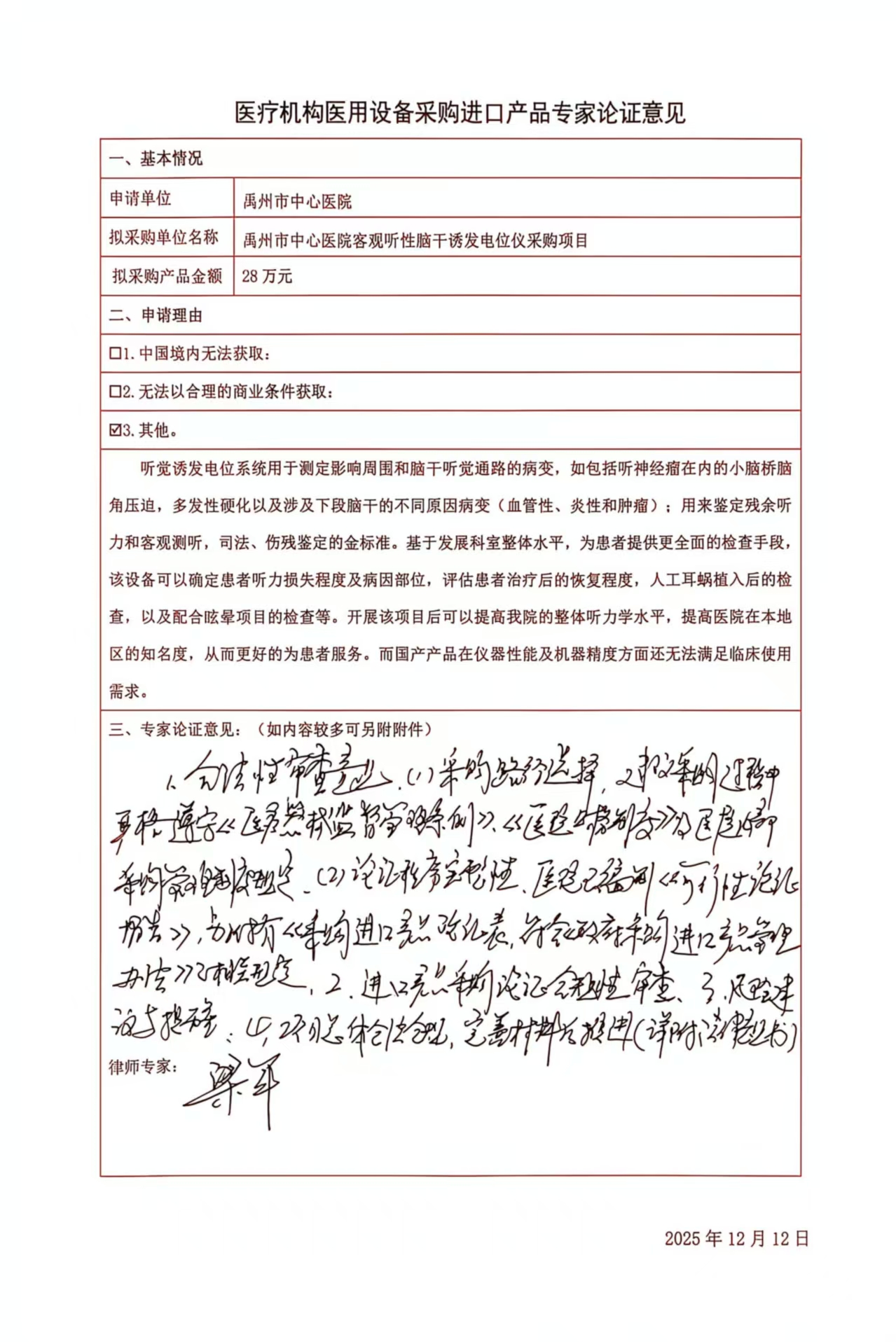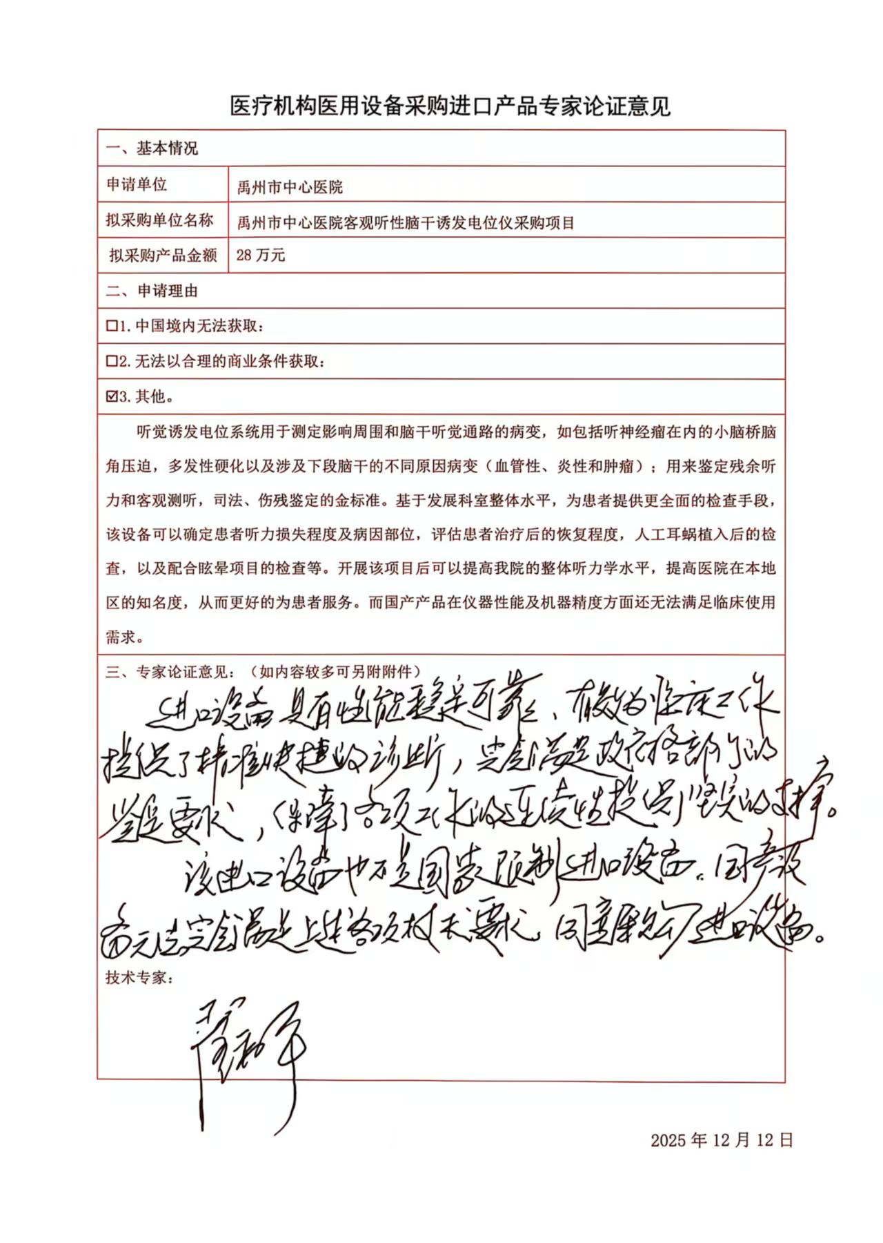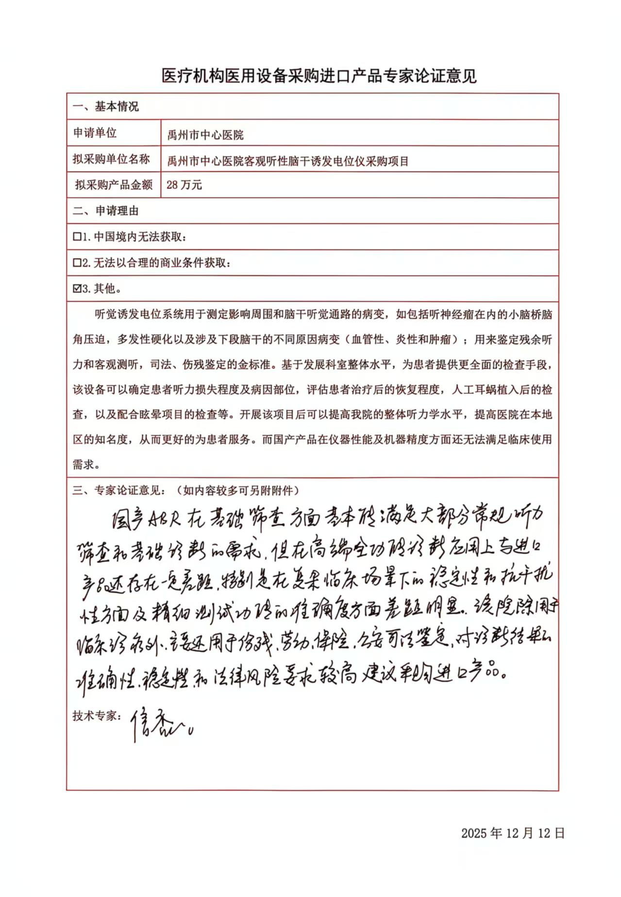 禹州市中心医院客观听性脑干诱发电位仪采购项目进口产品论证意见及技术参数专家论证意见公示