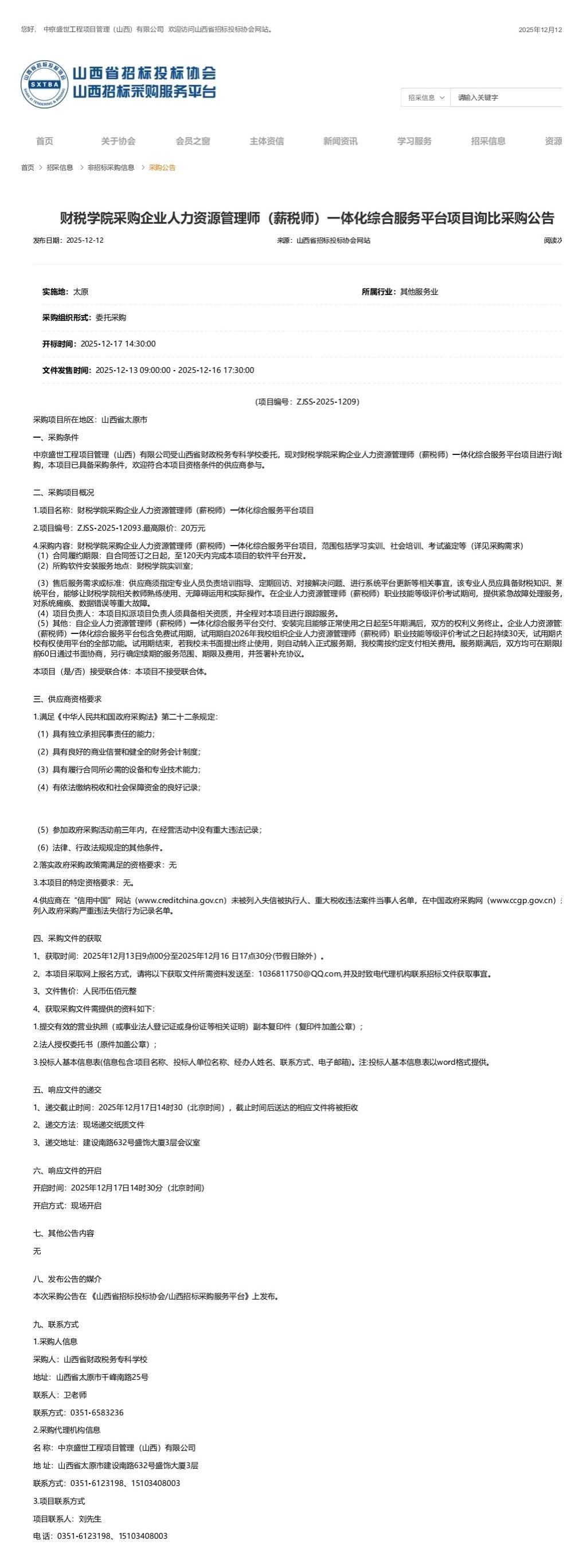 企业人力资源管理师(薪税师)一体化综合服务平台项目采购公告