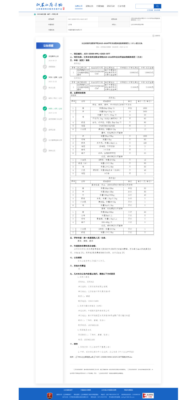 江苏农牧科技职业学院2025-2026学年实训用途动物采购项目(三次)成交公告