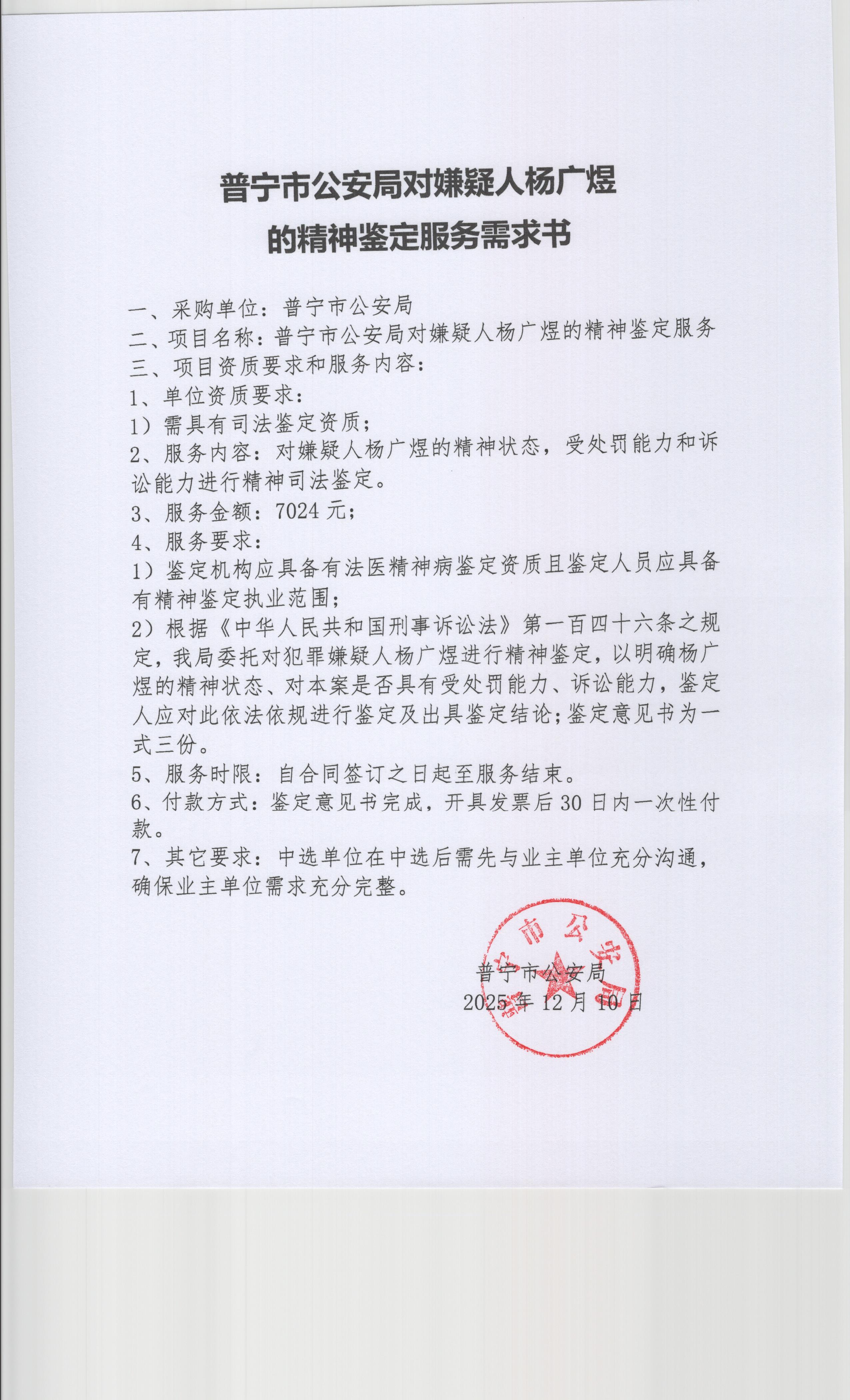 普宁市公安局对嫌疑人杨广煜的精神鉴定服务采购公告