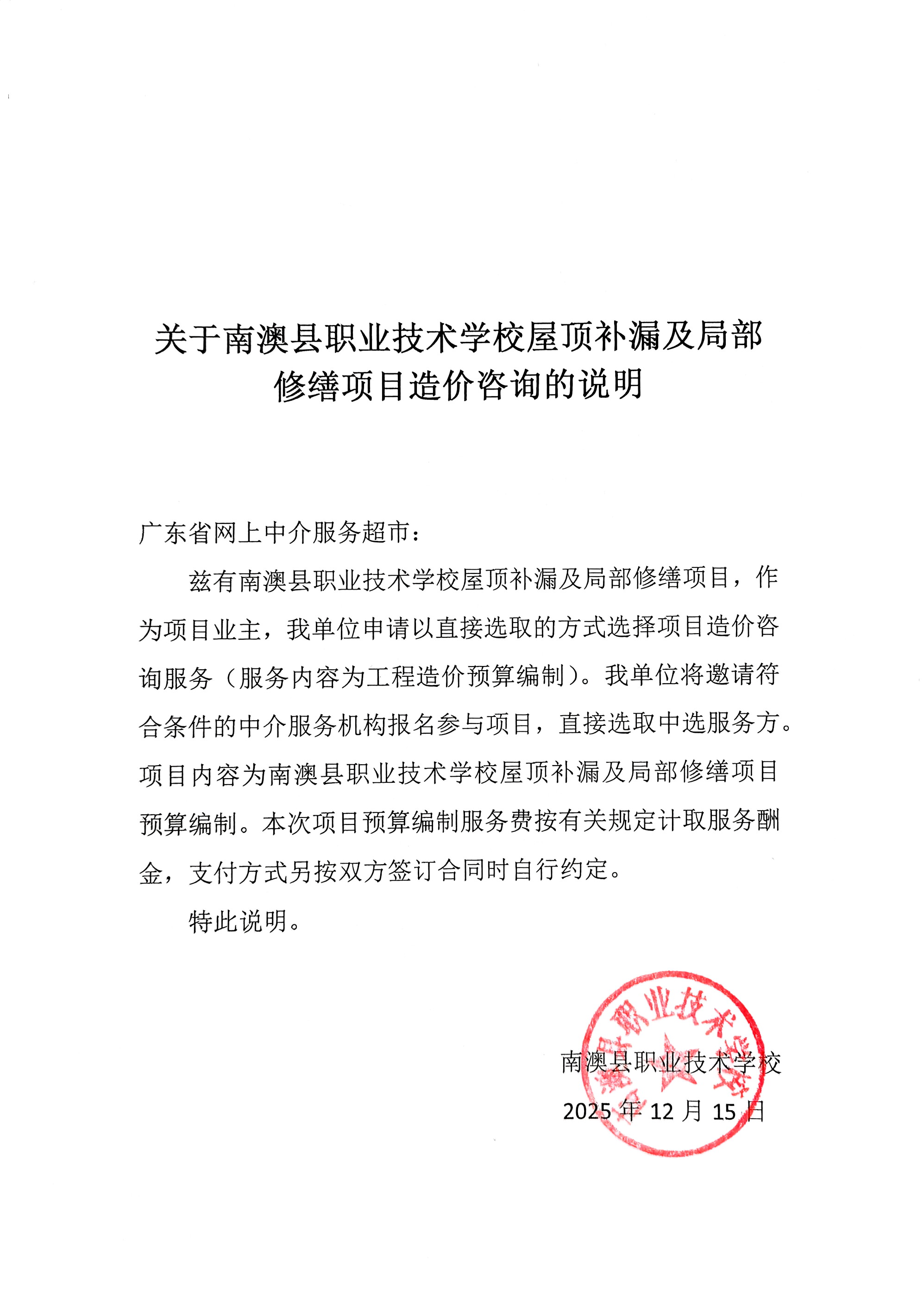 关于为【南澳县职业技术学校屋顶补漏及局部修缮项目(预算编制)】公开选取【工程造价咨询】机构的公告