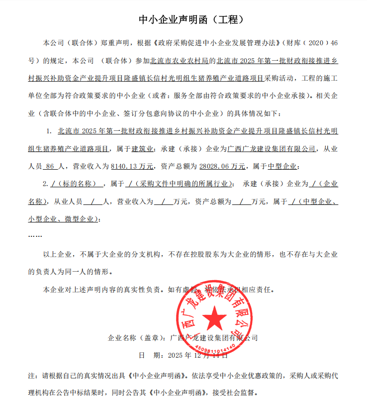 广西泰湖工程管理有限公司关于北流市2025年第一批财政衔接推进乡村振兴补助资金产业提升项目隆盛镇长信村光明组生猪养殖产业道路项目成交公告
