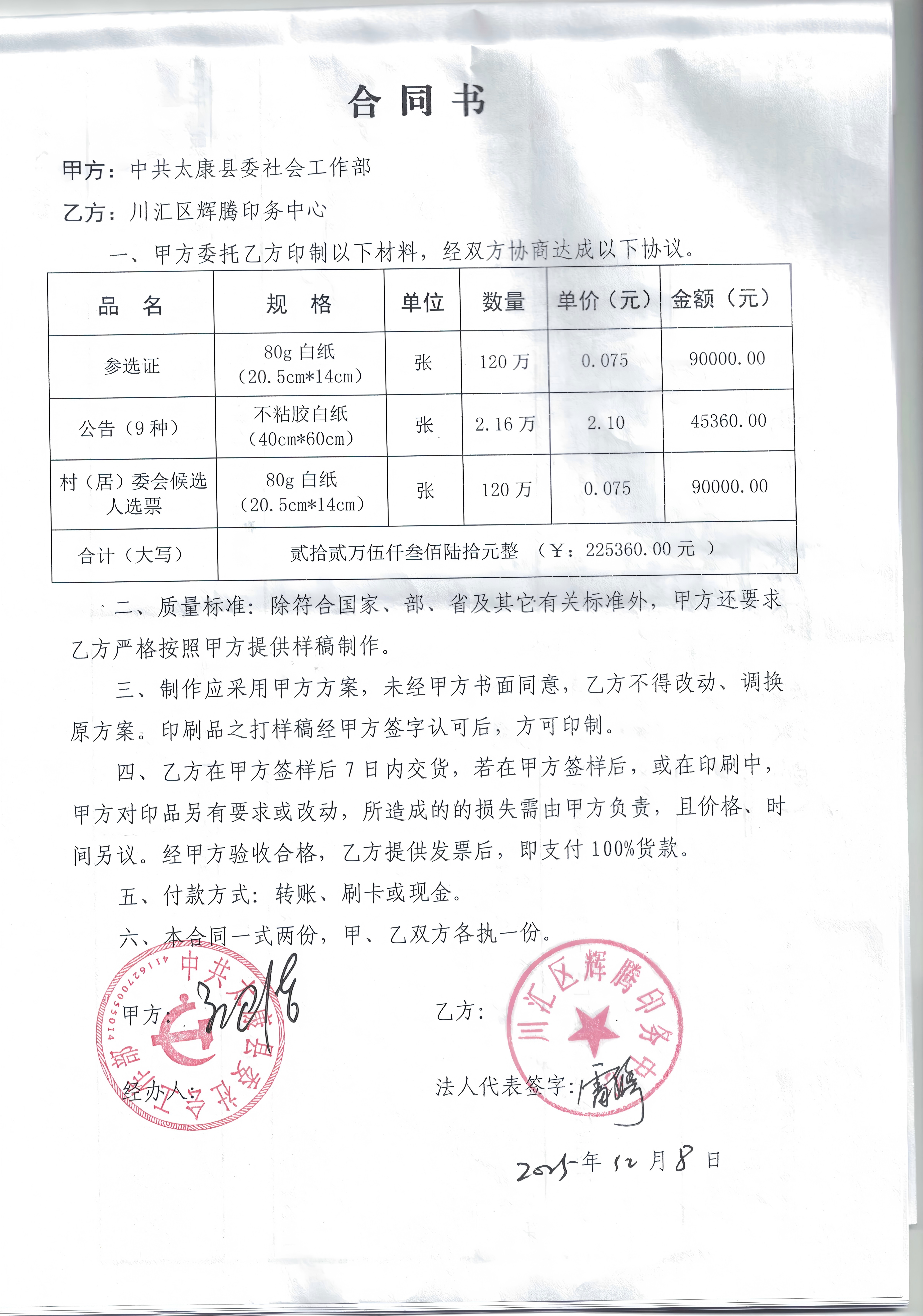 | 二、合同名称:印刷参选证公告候选人选票 | ||||||||||||