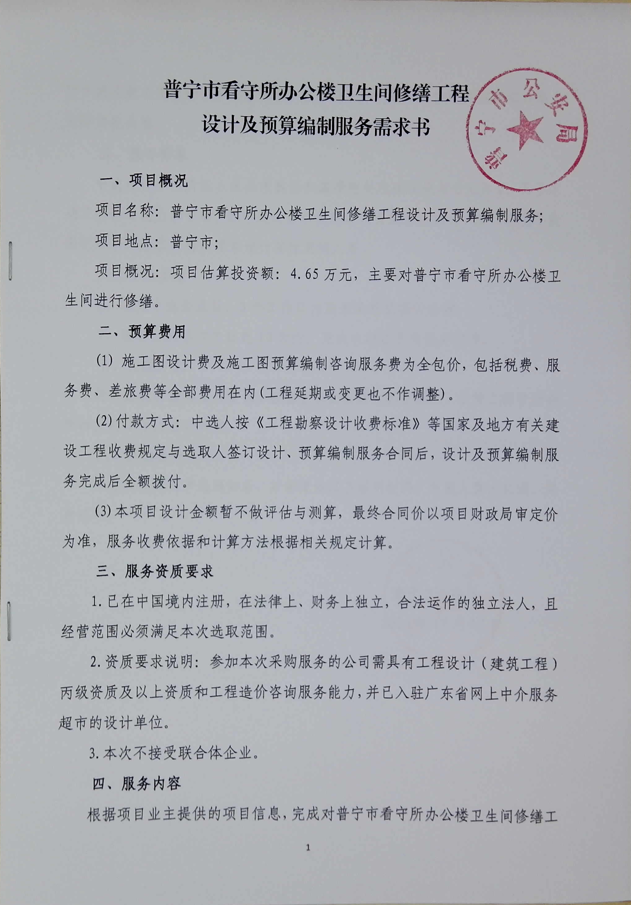 关于为【普宁市看守所办公楼卫生间修缮工程设计及预算编制服务】公开选取【工程造价咨询,工程设计】机构的公告
