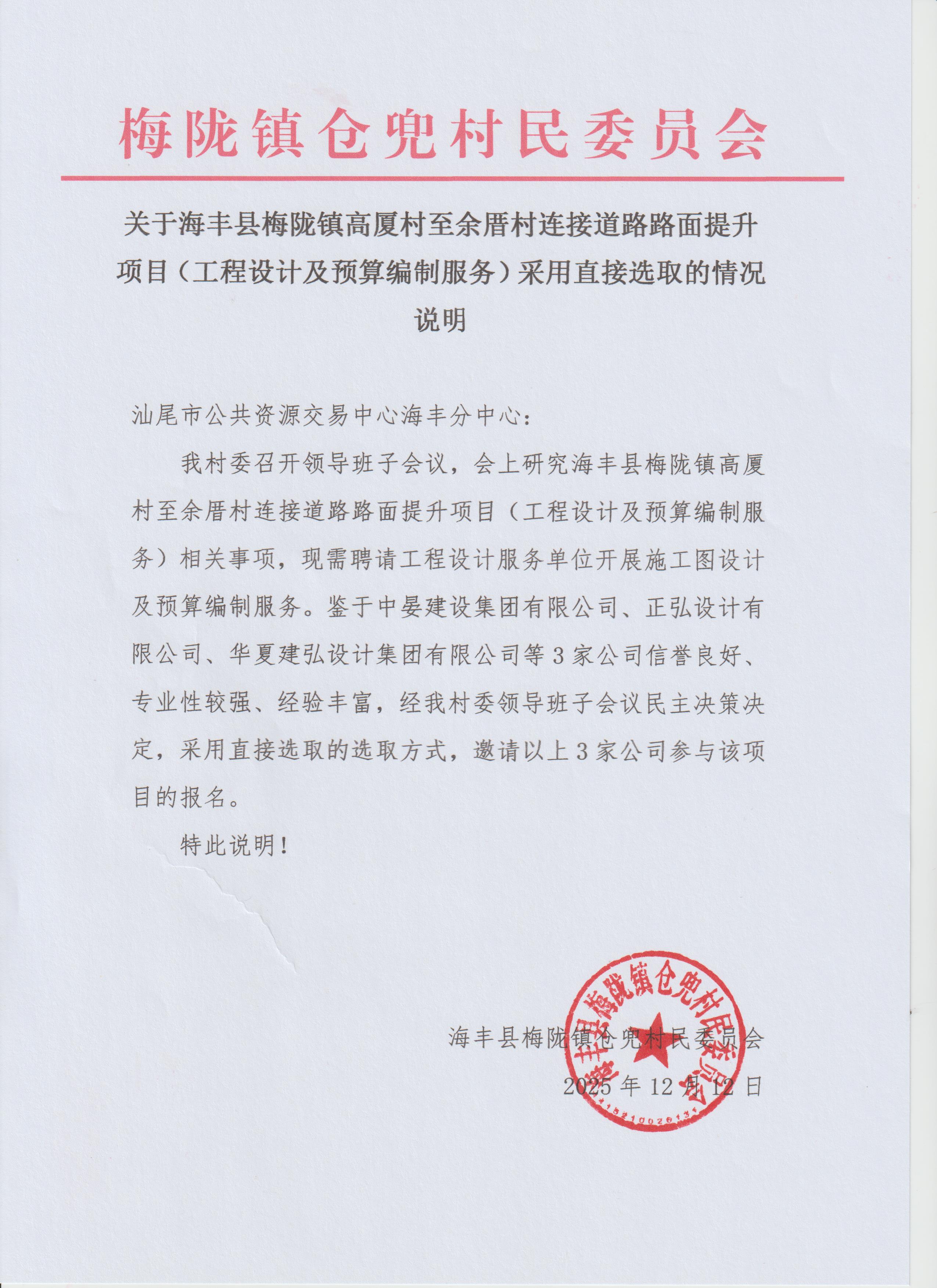 关于为【海丰县梅陇镇高厦村至余厝村连接道路路面提升项目(工程设计及预算编制服务)】公开选取【工程造价咨询,工程设计】机构的公告