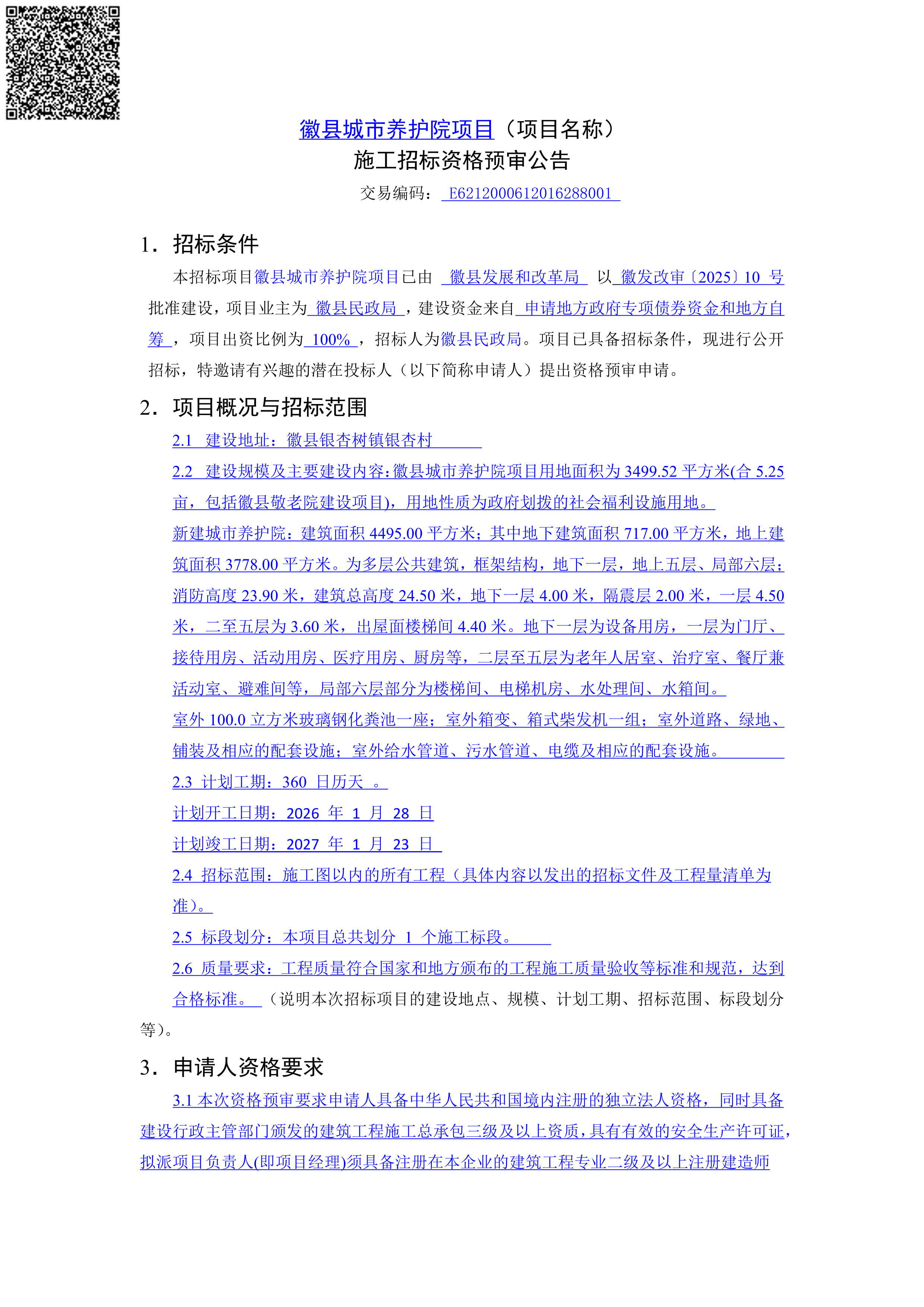 徽县城市养护院项目施工招标资格预审公告招标/资审公告