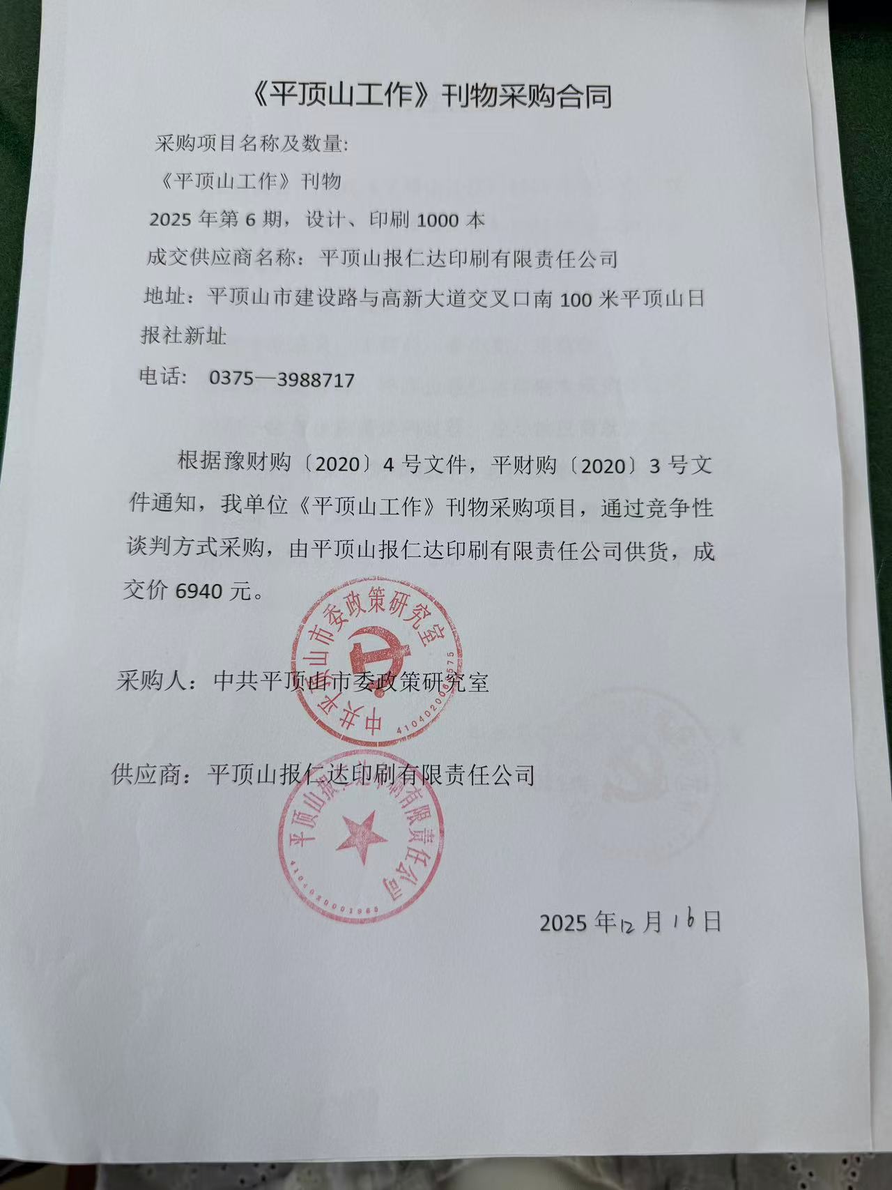 | 二、合同名称:中共平顶山市委政策研究室党刊《平顶山工作》****年第六期印刷 | ||||||||||||