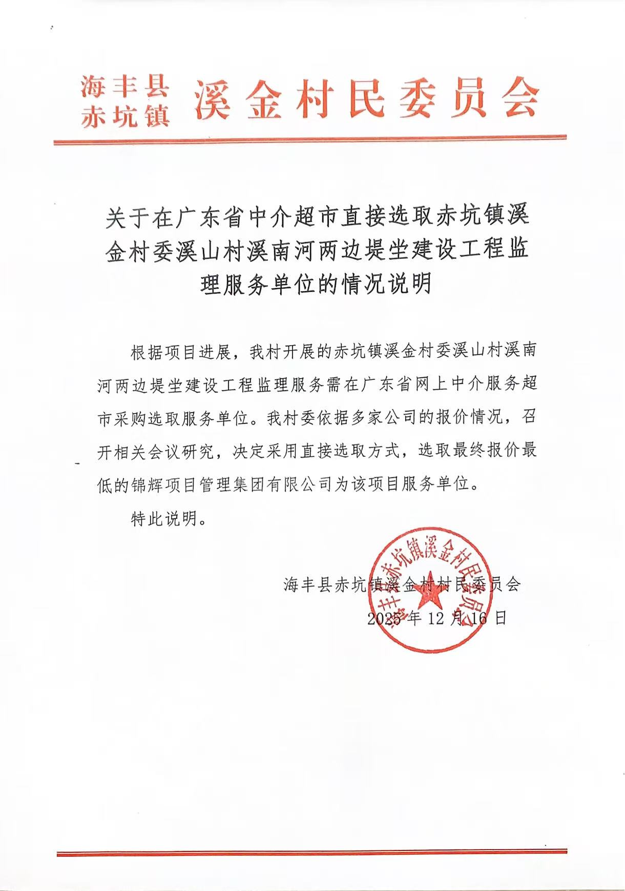 我单位于********** **:**, 在广东省网上中介服务超市为海丰县赤坑镇溪金村村民委员会公开选取工程监理中介服务机构,现将中选结果相关事项公告如下: