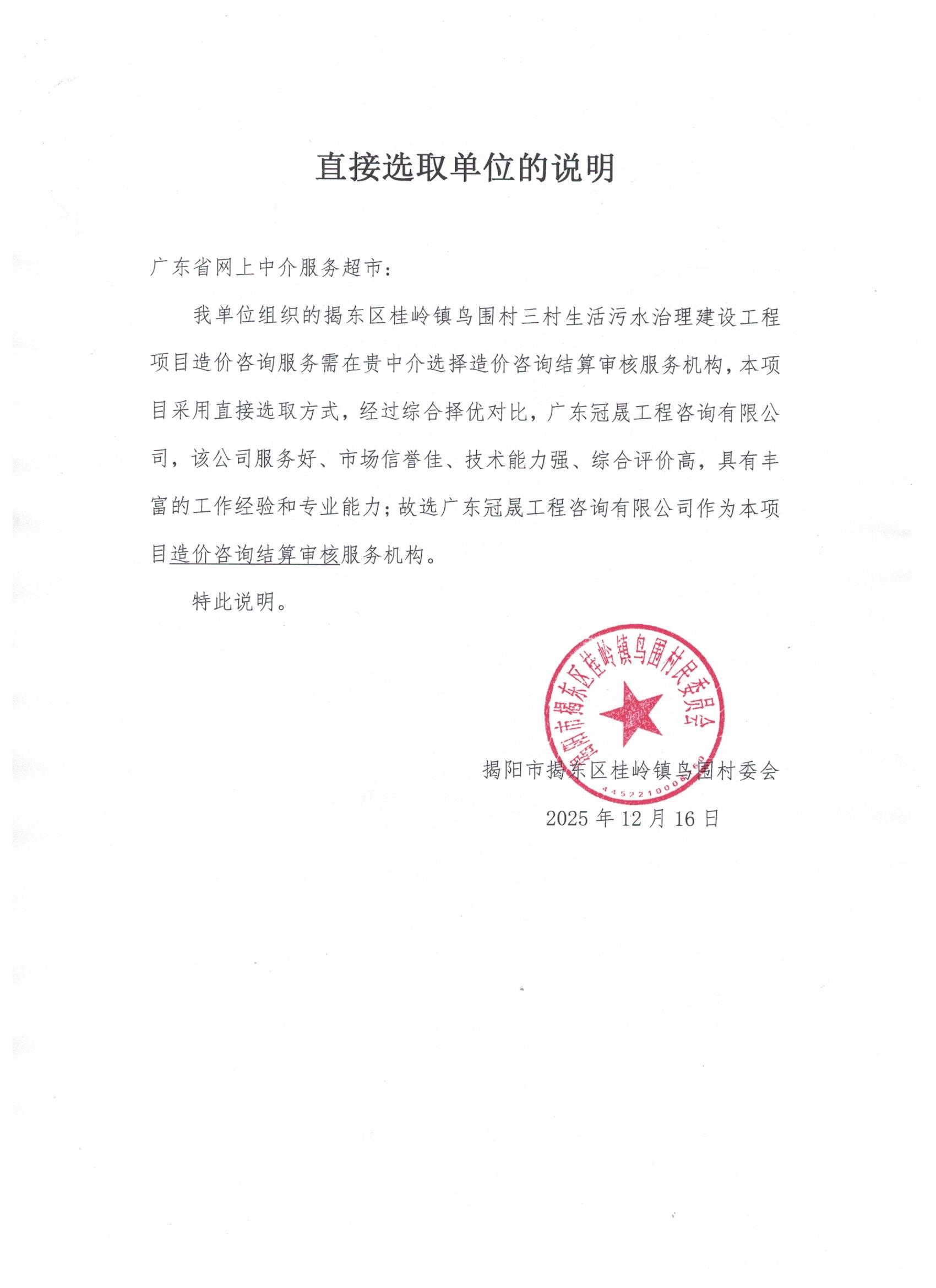 关于【揭东区桂岭镇鸟围村三村生活污水治理建设工程项目造价咨询服务】中选结果的公告