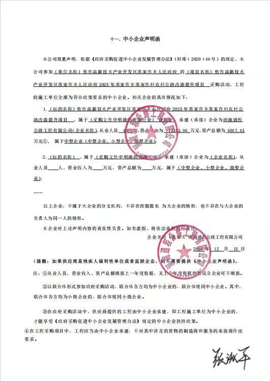 焦作高新技术产业开发区苏家作乡人民政府2025年苏家作乡苏家作村农村公路改造提升项目成交结果公告