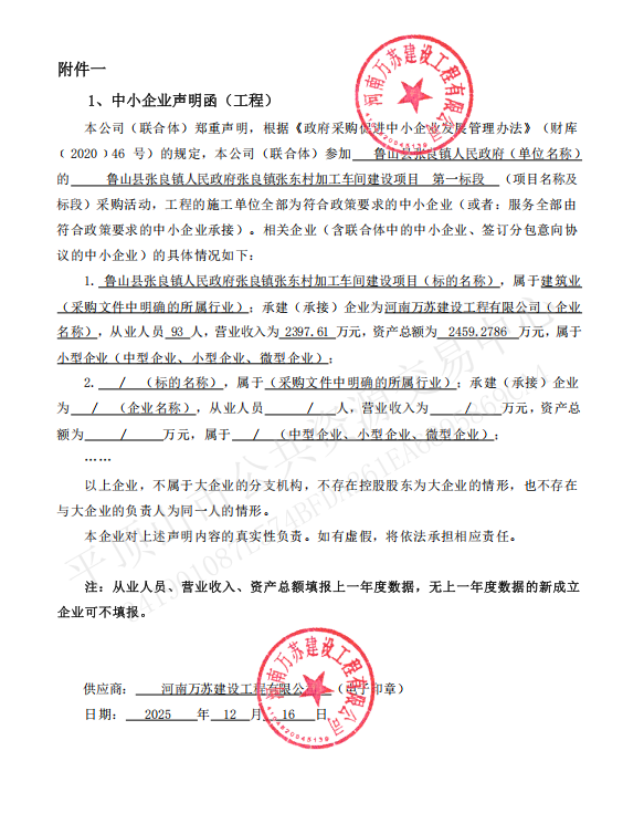 【平公资采20251182号】鲁山县张良镇人民政府张良镇张东村加工车间建设项目-成交公告