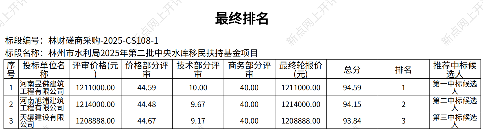 | 评标结果如下:第一中标候选人:河南昱佛建筑工程有限公司,技术和商务评审得分:**分,价格评审得分**.**分,总分**.**分;第二中标候选人:河南旭浦建筑工程有限公司,技术和商务评审得分:**.**分,价格评审得分**.**分,总分**.**分;第三中标候选人:天渠建设有限公司,技术和商务评审得分:**.**分,价格评审得分**.**分,总分**.**分; 其他供应商:河南博仁建筑工程有限公司,技术和商务评审得分:**.**分,价格评审得分**分,总分**.**分;废标情况:无。各有关当事人对评标结果如有异议者,可以在公告结束之日起七个工作日内,以书面形式向采购人、采购代理机构提出质疑(加盖单位公章且法定代表人签字,并附带相应的证明材料),由法定代表人或其授权代表携带企业营业执照复印件(加盖公章)及授权委托书、本人身份证件(原件)一并提交(邮寄、邮件不予受理),并以质疑函接受确认日期作为受理时间。逾期未提交或未按照要求提交的质疑函将不予受理。 | |||||||||||||||||||||||||||||||