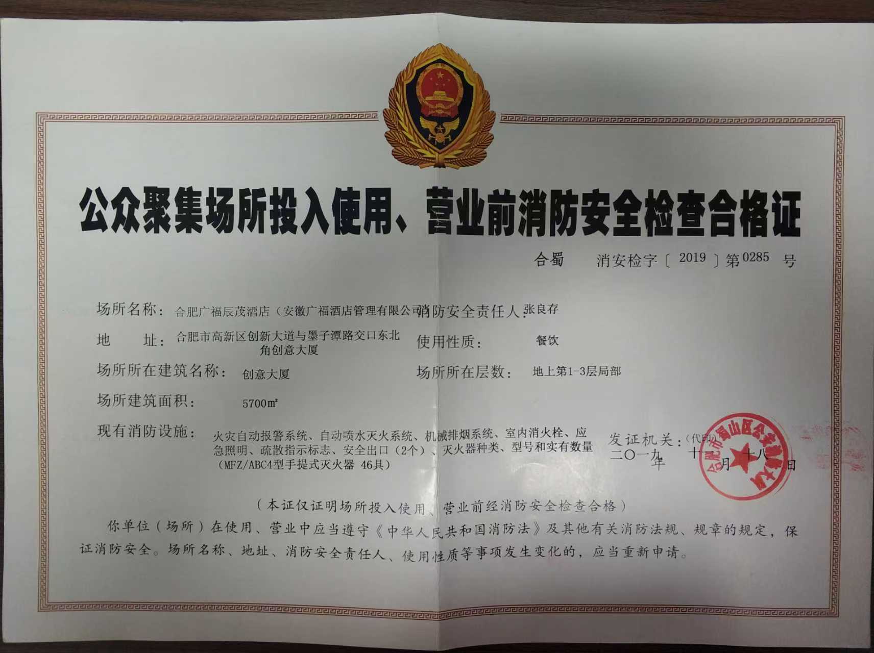 有效期内的消防安全检查合格证明:广福辰茂酒店消防*.***
