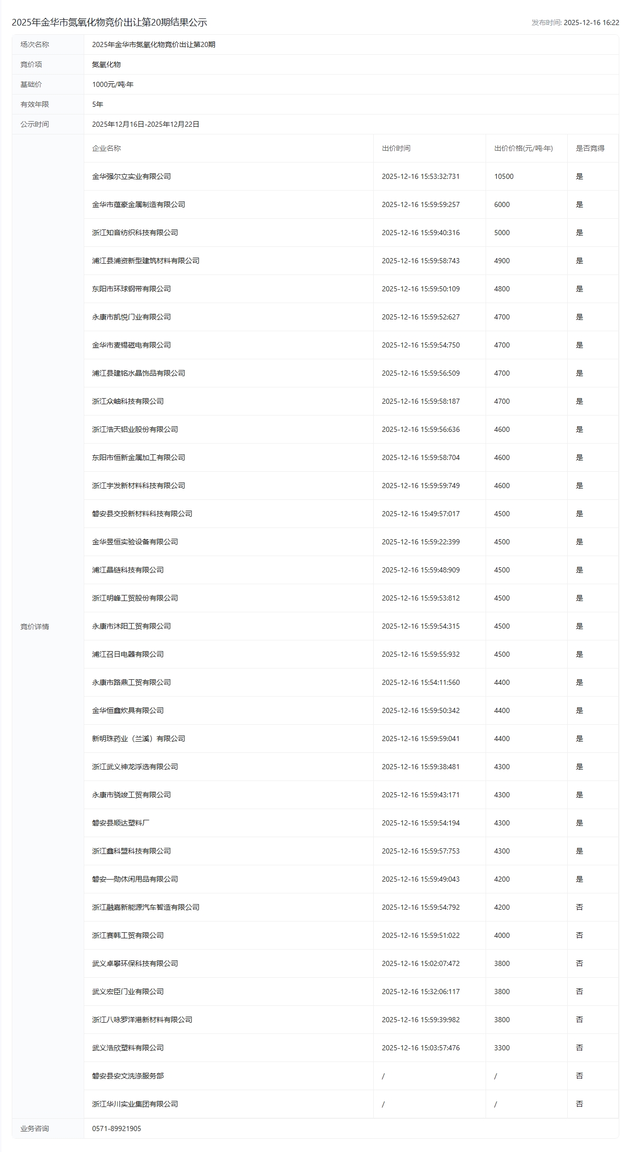 华市氮氧化物竞价出让第20期结果公示