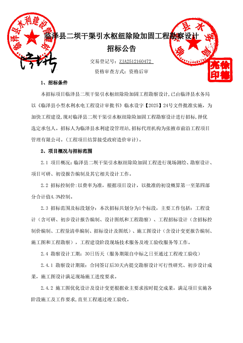 临泽县二坝干渠引水枢纽除险加固工程勘察设计招标公告