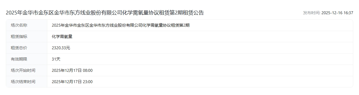 华市金东区金华市东方线业股份有限公司化学需氧量协议租赁第2期租赁公告