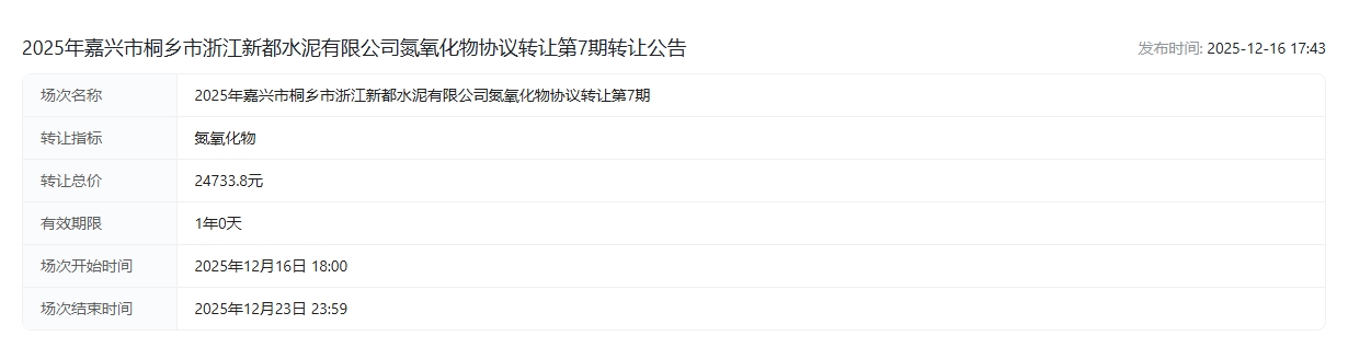市浙江新都水泥有限公司氮氧化物协议转让第7期转让公告