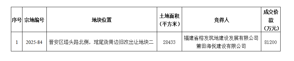 2025年福州市第十二次公开出让国有建设用地使用权成交结果公布