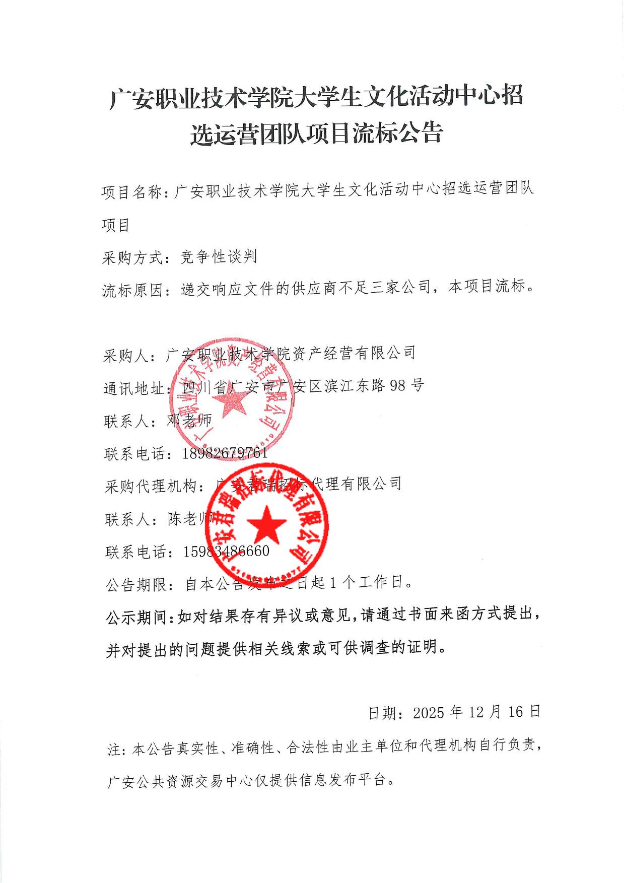 广安职业技术学院大学生文化活动中心招选运营团队项目流标公告