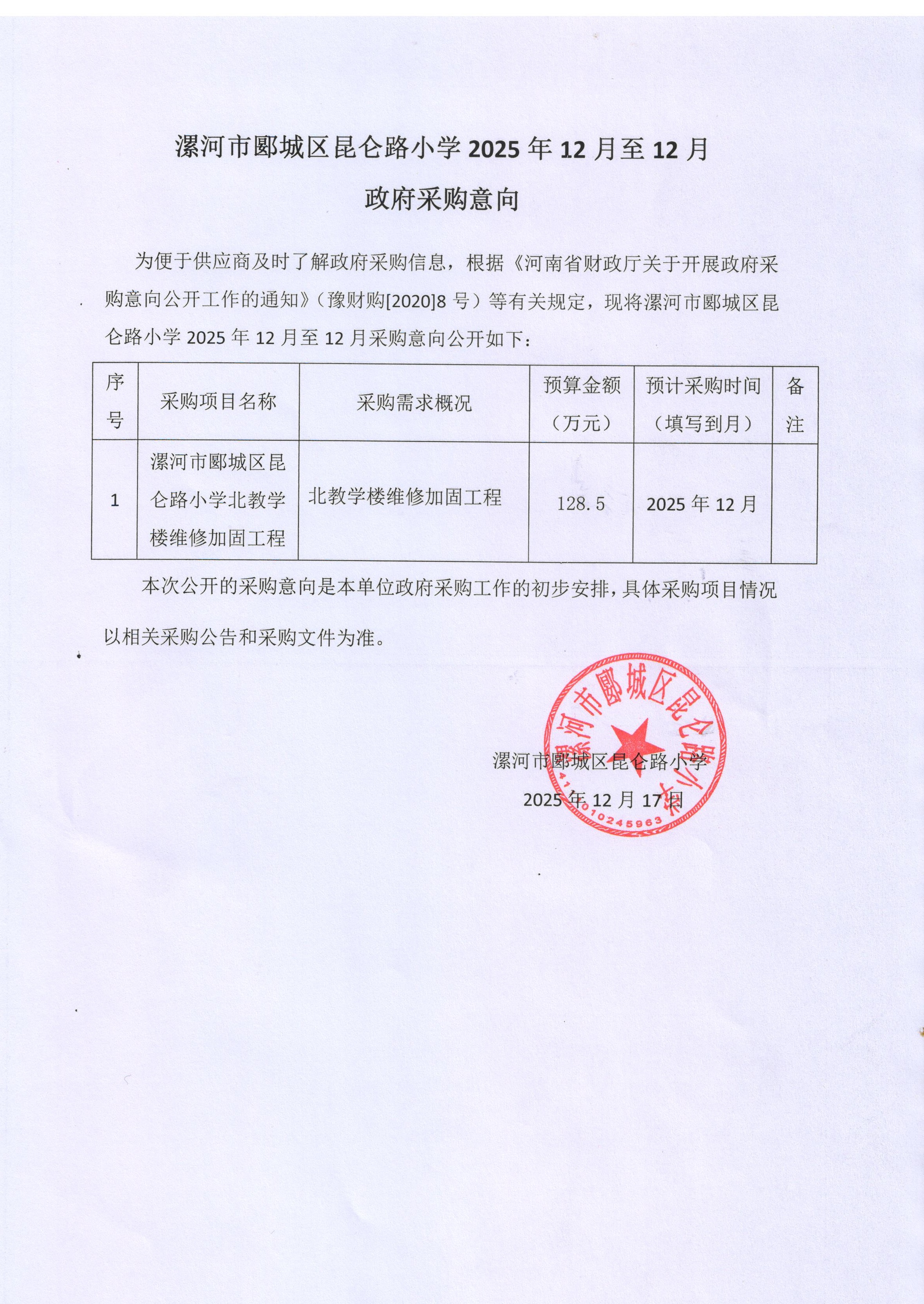 漯河市郾城区昆仑路小学2025年12月政府采购意向