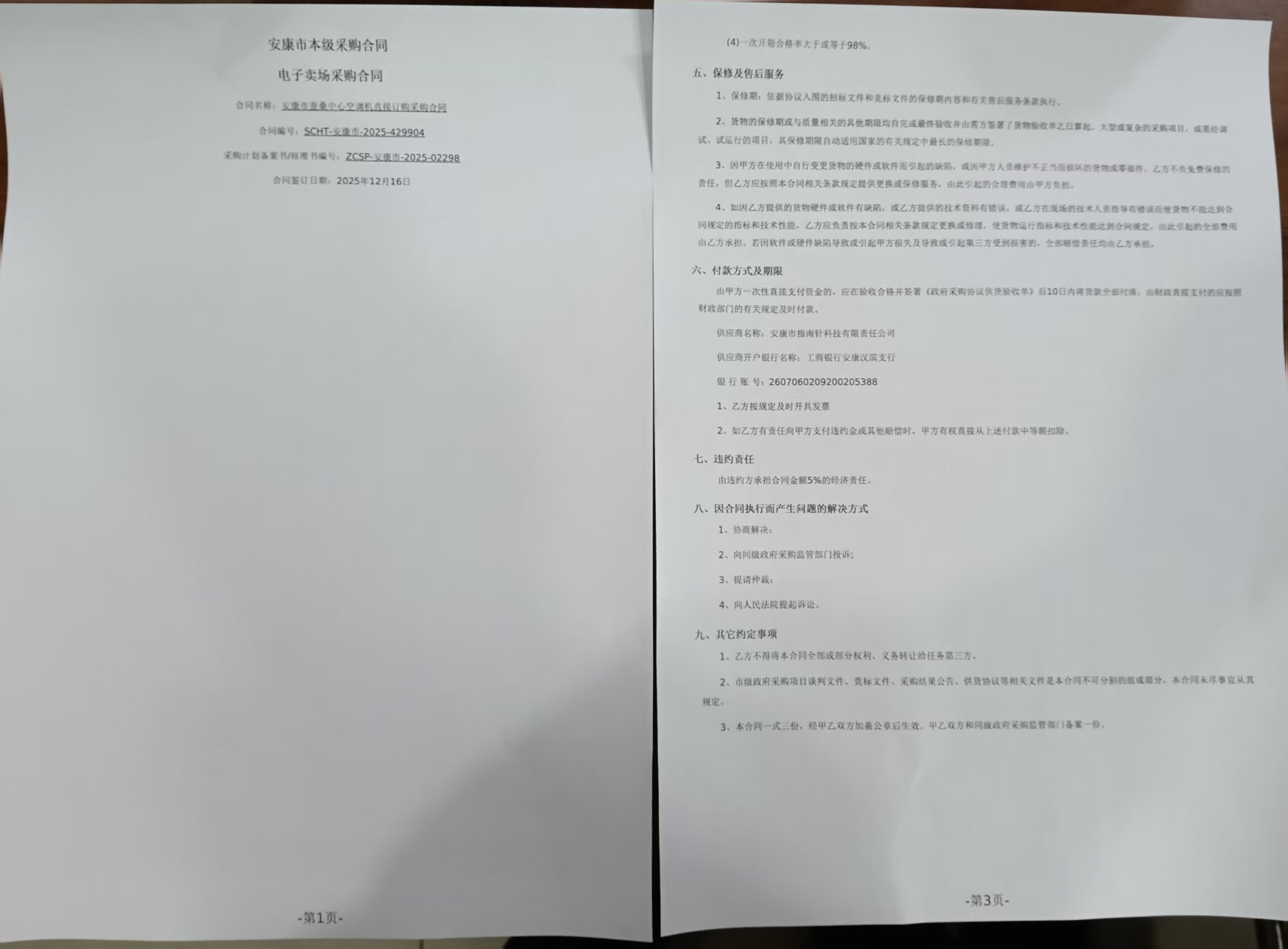 二、合同名称:安康市蚕桑中心空调机直接订购采购合同