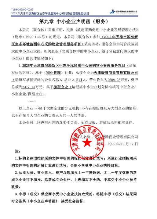 受天津市滨海新区生态环境监测中心委托,天津市滨海新区政府采购中心以公开招标方式,对****年天津市滨海新区生态环境监测中心采购物业管理服务项目实施采购,现将中标结果公布如下: 一、项目名称和编号 *.项目名称:****年天津市滨海新区生态环境监测中心采购物业管理服务项目 *.项目编号:**************** 二、中标信息 *.中标供应商名称:天津骏腾商业管理有限公司 *.中标供应商地址:天津市滨海新区北塘街道欣展道***号(一层**门****室) *.供应商评审报价、评审总得分及排序情况:见附件 *.主要中标标的名称、规格型号、数量、单价、服务要求或者标的基本概况:见附件 三、评标委员会成员名单 王金安、陆建实、马楠、李慧、陈继鹏(采购人代表) 四、项目联系人及联系方式 *.联系人:刘春雪 *.联系方式:******** 五、采购人的名称、地址和联系方式 *.采购人名称:天津市滨海新区生态环境监测中心 *.采购人地址:天津市滨海新区生态环境监测中心 *.采购人联系电话:袁大祥 ******** 六、采购代理机构的名称、地址和联系方式 *.采购代理机构名称:天津市滨海新区政府采购中心 *.采购代理机构地址:天津市滨海新区营口道***号 *.采购代理机构联系方式:************ 七、质疑方式 参与本项目政府采购活动的供应商认为中标结果使自己的合法权益受到损害的,可以在中标结果公告期限届满之日起*个工作日内,以书面形式向采购人和天津市滨海新区政府采购中心提出质疑,逾期不予受理。 八、本项目向中标供应商收取服务费*元。 九、中标结果公告期限 中标结果的公告期限为*个工作日。 十、招标文件公告:见附件