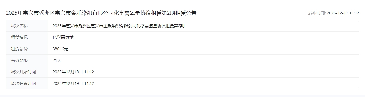 市金乐染织有限公司化学需氧量协议租赁第2期租赁公告