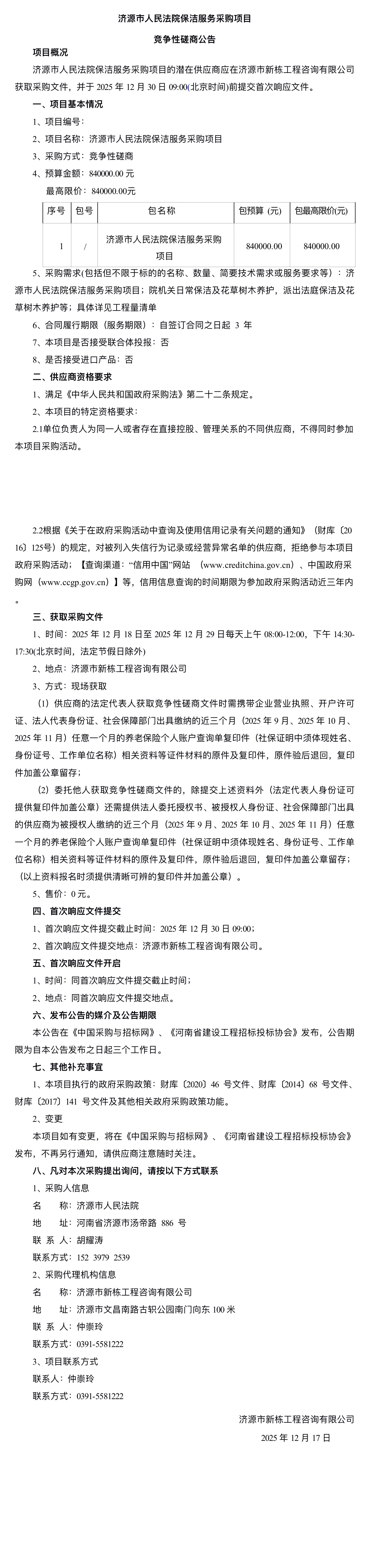 济源市人民法院保洁服务采购项目竞争性磋商公告