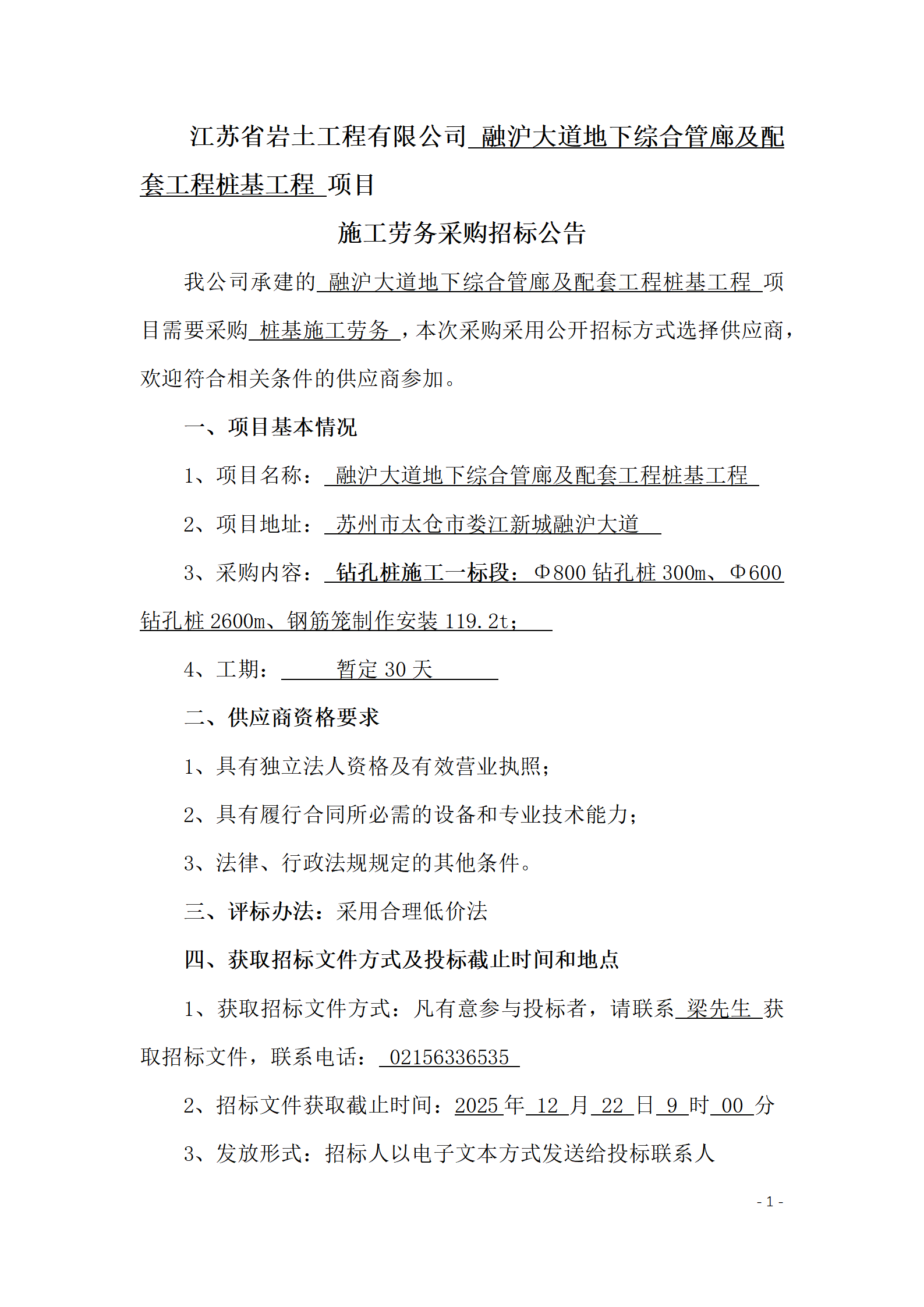 江苏省岩土工程有限公司融沪大道地下综合管廊及配套工程桩基工程项目施工劳务采购招标公告