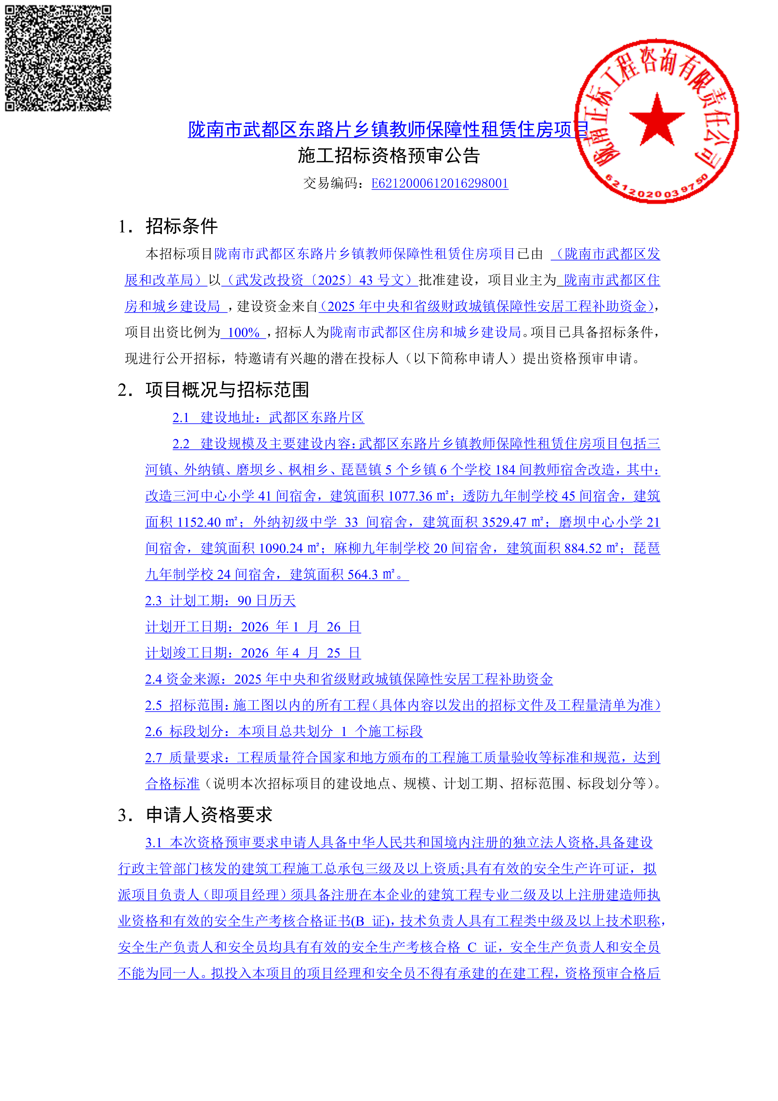 陇南市武都区东路片乡镇教师保障性租赁住房项目施工招标资格预审公告