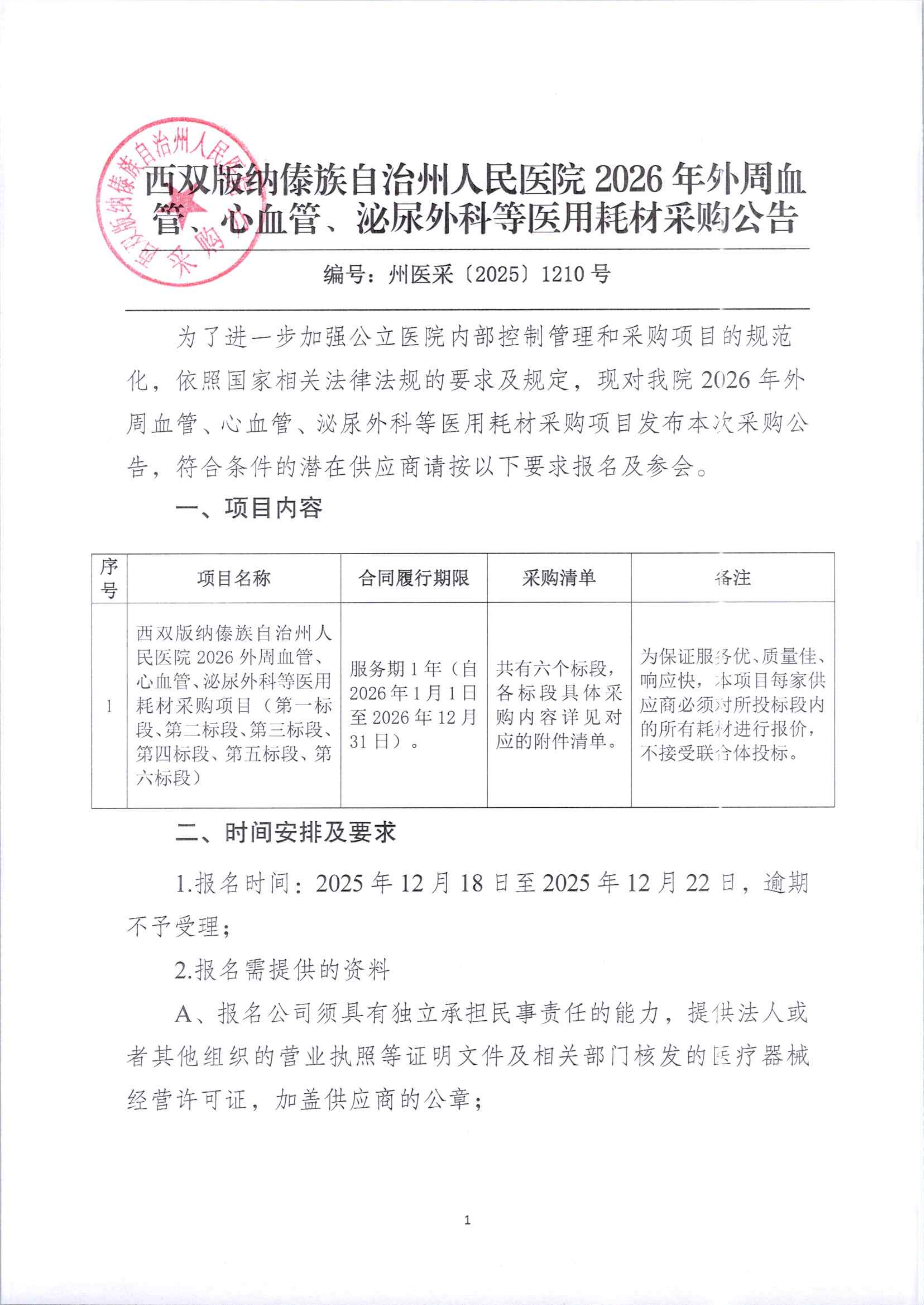 西双版纳傣族自治州人民医院2026年外周血管、心血管、泌尿外科等医用耗材采购公告
