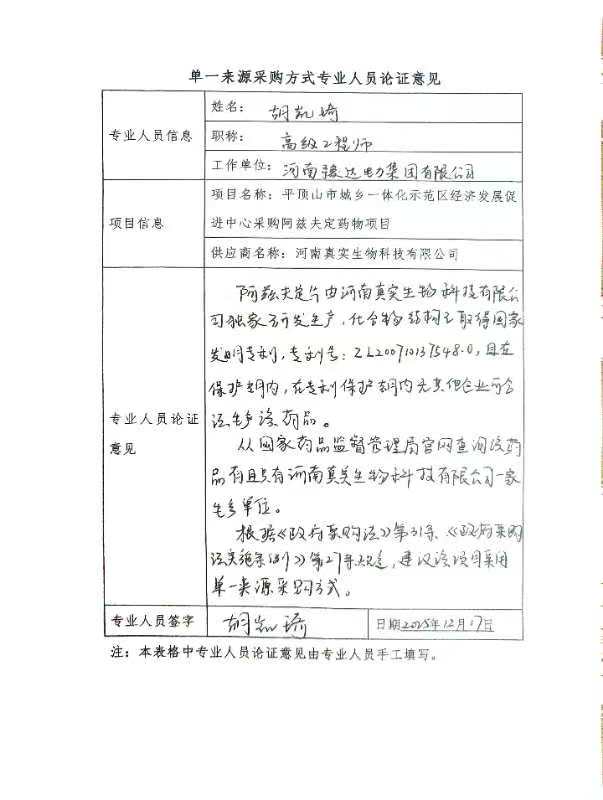 | 河南真实生物科技有限公司生产的阿兹夫定片取得了国家发明专利,无替代产品,并经过国家合法登记,且在有效期内,技术参数唯一,产品来源单一。河南真实生物科技有限公司是本产品唯一生产商,只能从该供应商处采购,具有唯一性。依据《中华人民共和国政府采购法》“第三十一条 符合下列情形之一的货物或者服务,可以依照本法采用单一来源方式采购:(一)只能从唯一供应商处采购的”和《中华人民共和国政府采购法实施条例》“第二十七条政府采购法第三十一条第一项规定的情形,是指因货物或者服务使用不可替代的专利、专有技术,或者公共服务项目具有特殊要求。结合本项目的需求,本项目拟采用单一来源方式采购。 | ||||||||||||||||||||||||