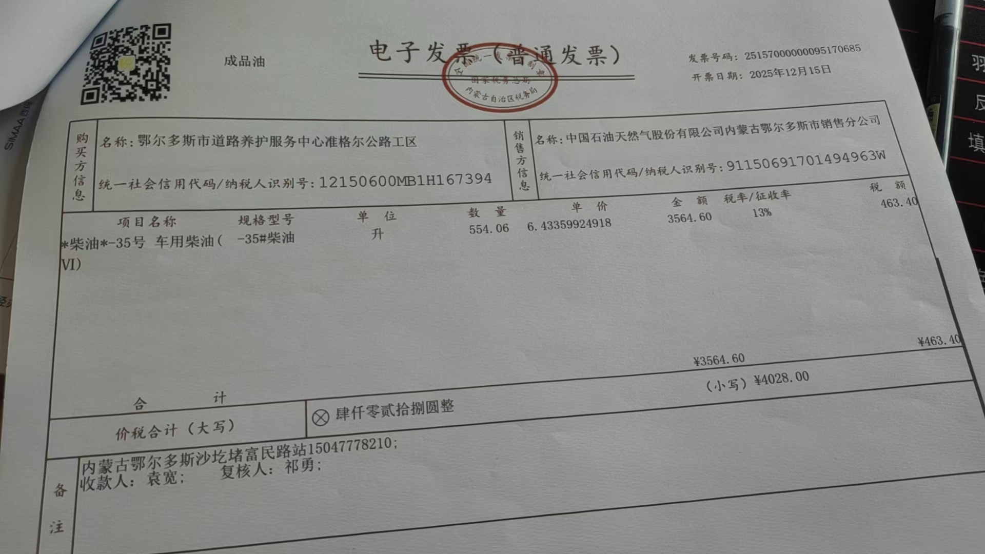 鄂尔多斯市道路养护服务中心准格尔公路工区榆树湾公路养护站车辆油料费4028政府采购合同公告