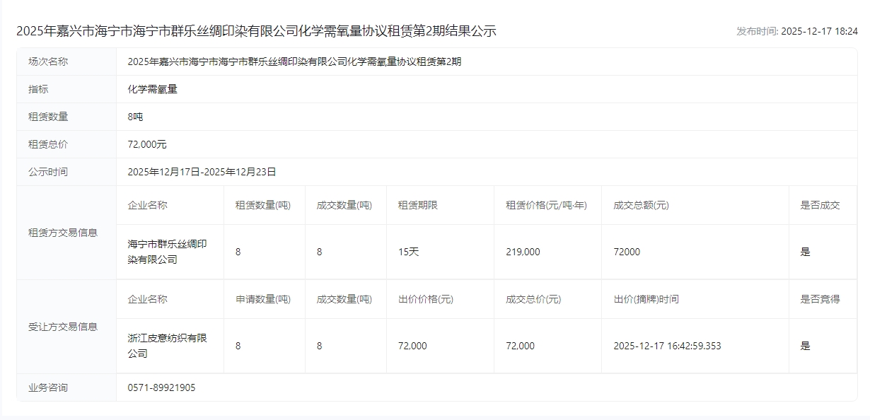 市海宁市海宁市群乐丝绸印染有限公司化学需氧量协议租赁第*期结果公示